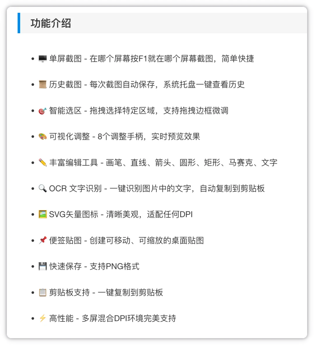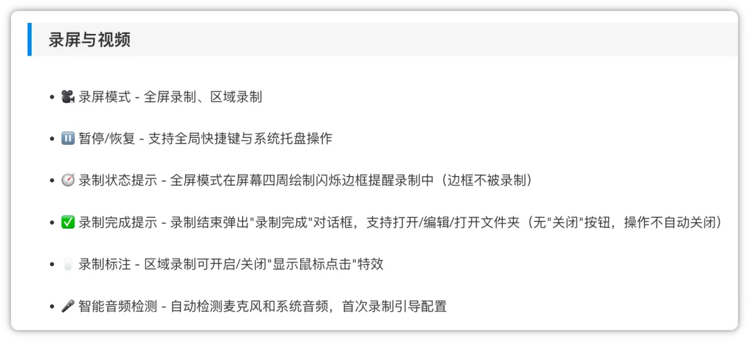 这里为了大家更能快速知道这款软件的功能我给大家整理了一个功能列表相信大家可以很快了解它的强大,主要是3大类,基础截图功能,视频录制功能,视频剪辑转换功能,截图录屏和后期一体的开源神器。