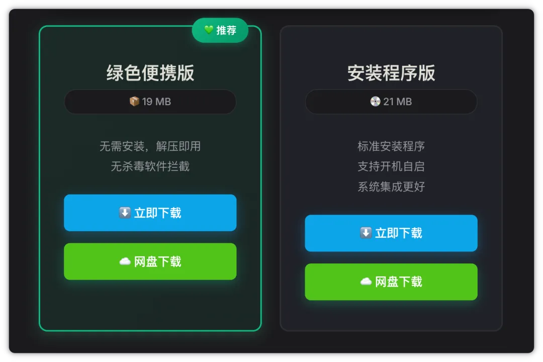 提供了便携版和安装版,大家可以根据自己的需求来安装对应的版本,长期使用建议大家安装程序版本,毕竟功能更丰富稳定。