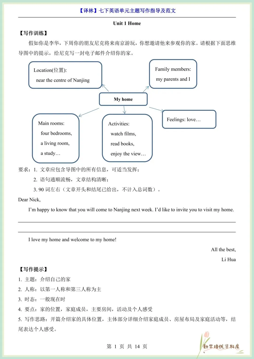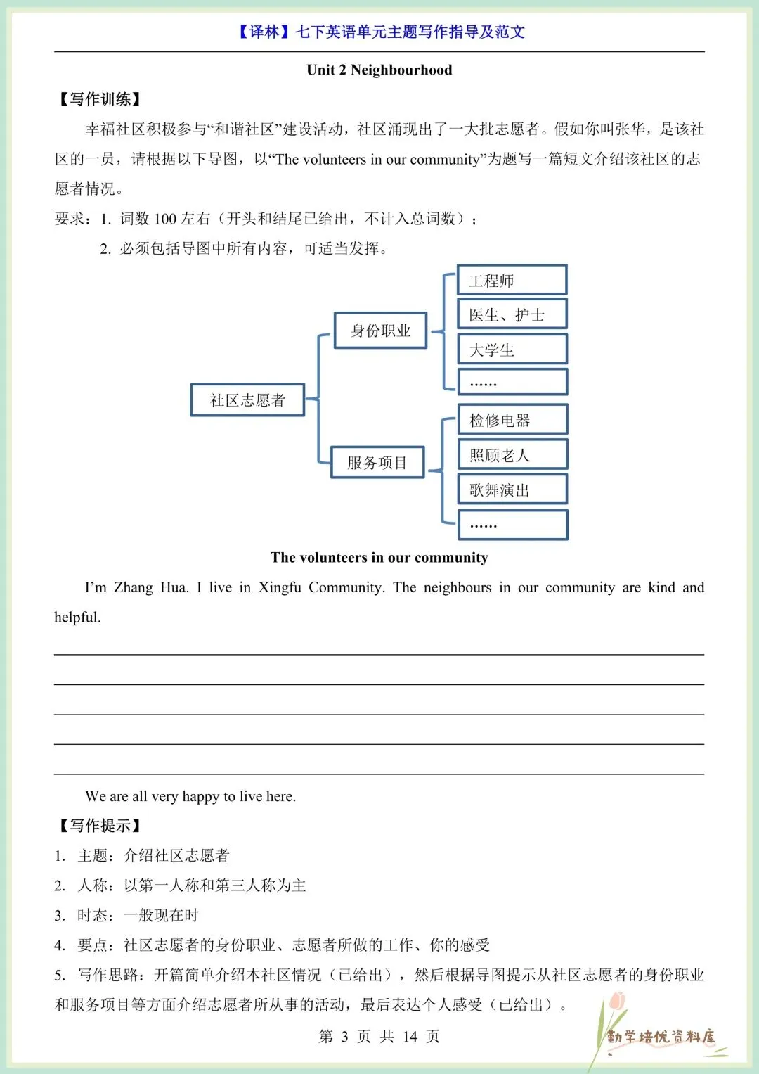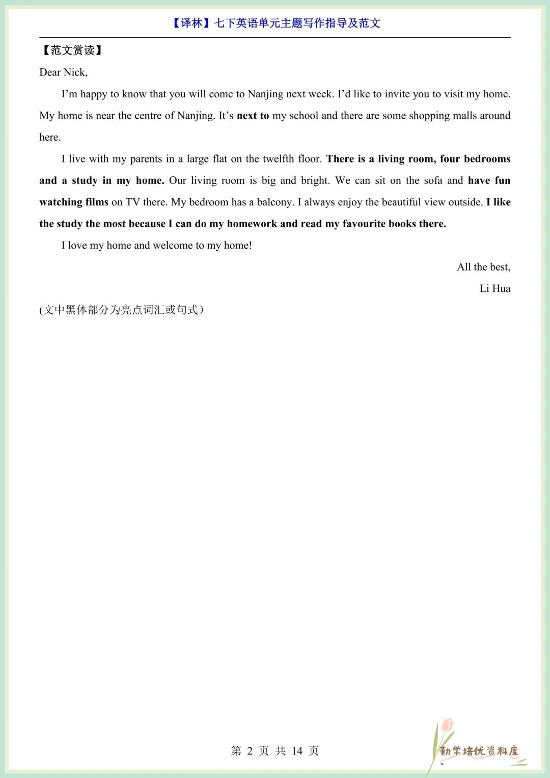 2026春新(译林版)七年级下册英语单元主题写作指导及范文,电子版可下载打印!