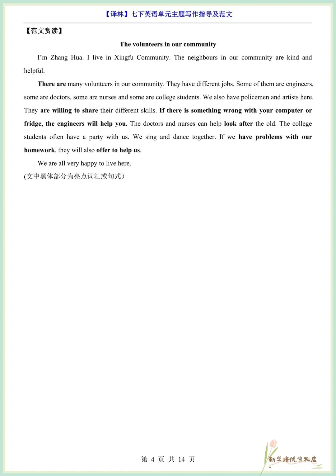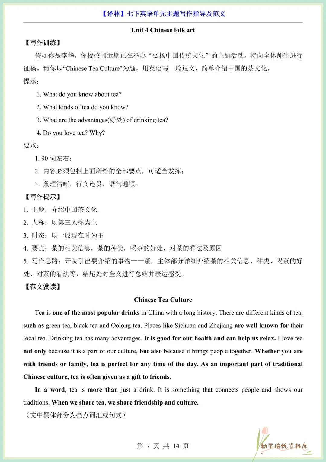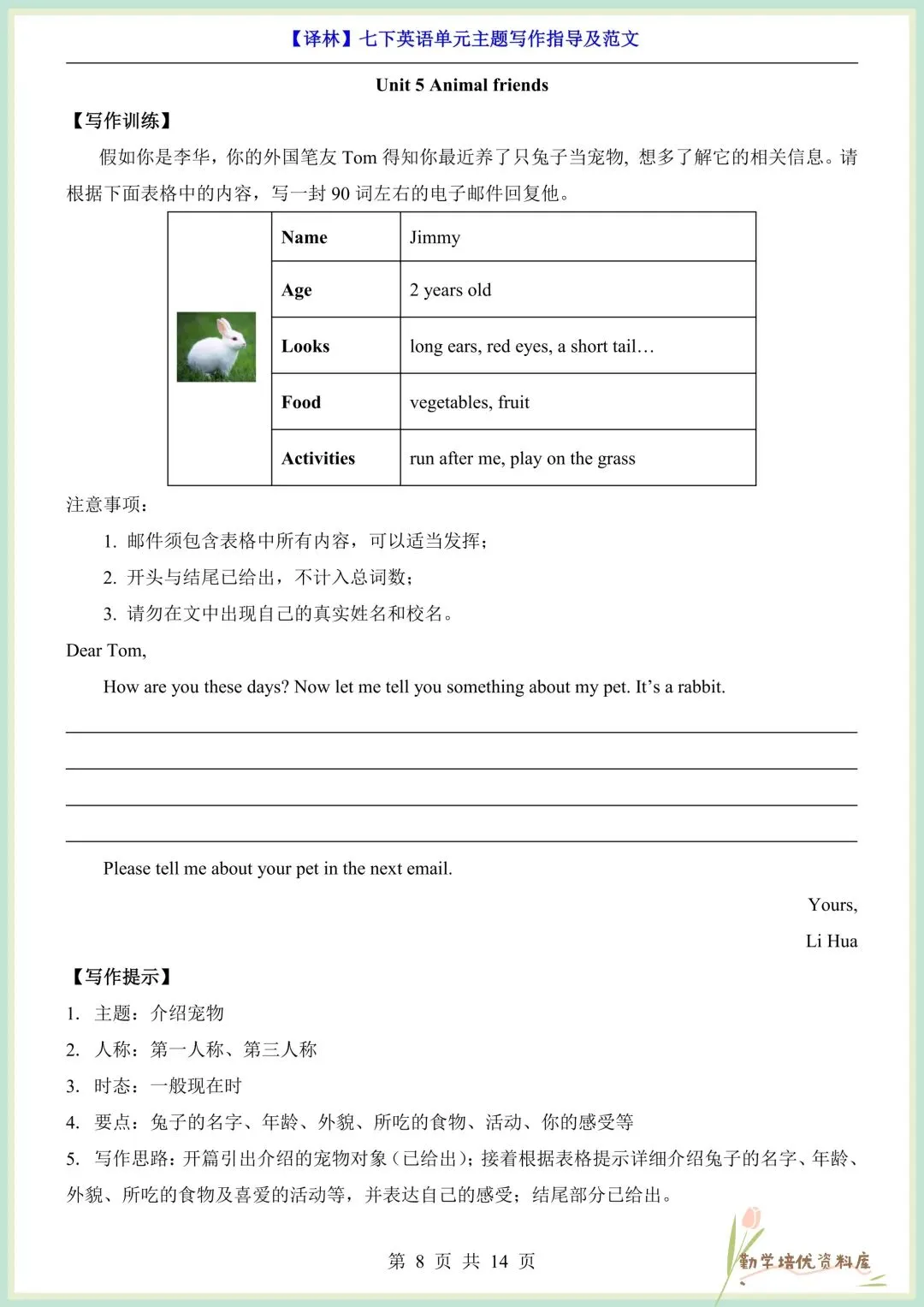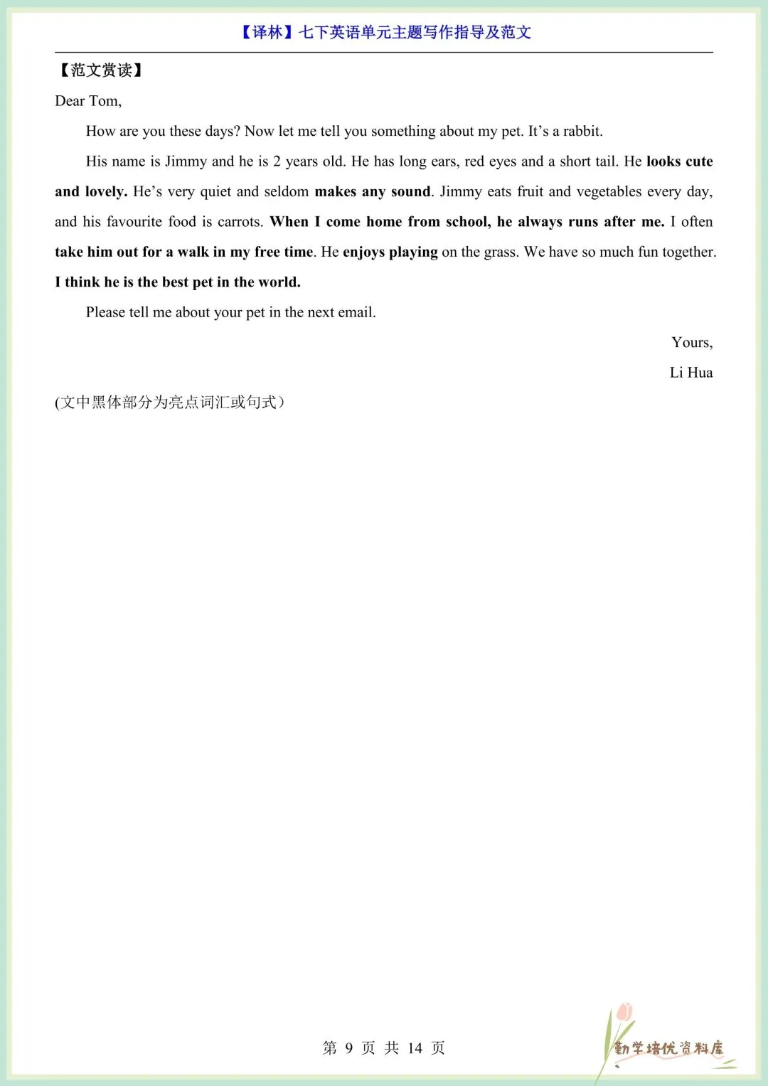 2026春新(译林版)七年级下册英语单元主题写作指导及范文,电子版可下载打印!