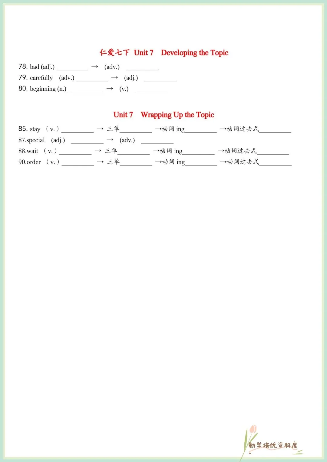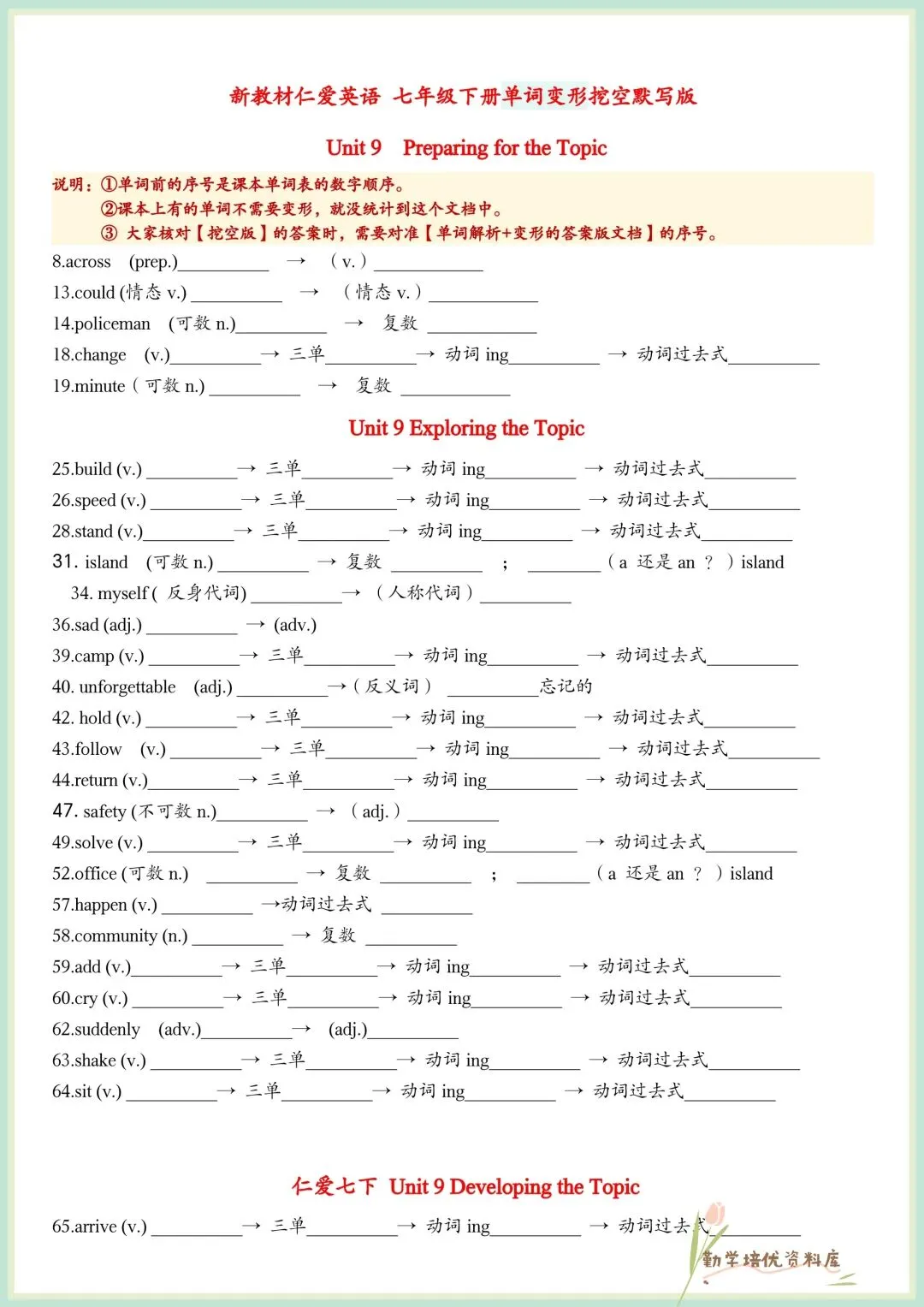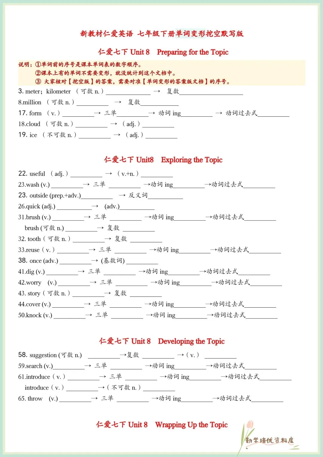 今日老师精心给大家整理了:2026春新(仁爱版)七年级下册英语单词词性变形挖空(默写版+答案版),电子版可下载打印!