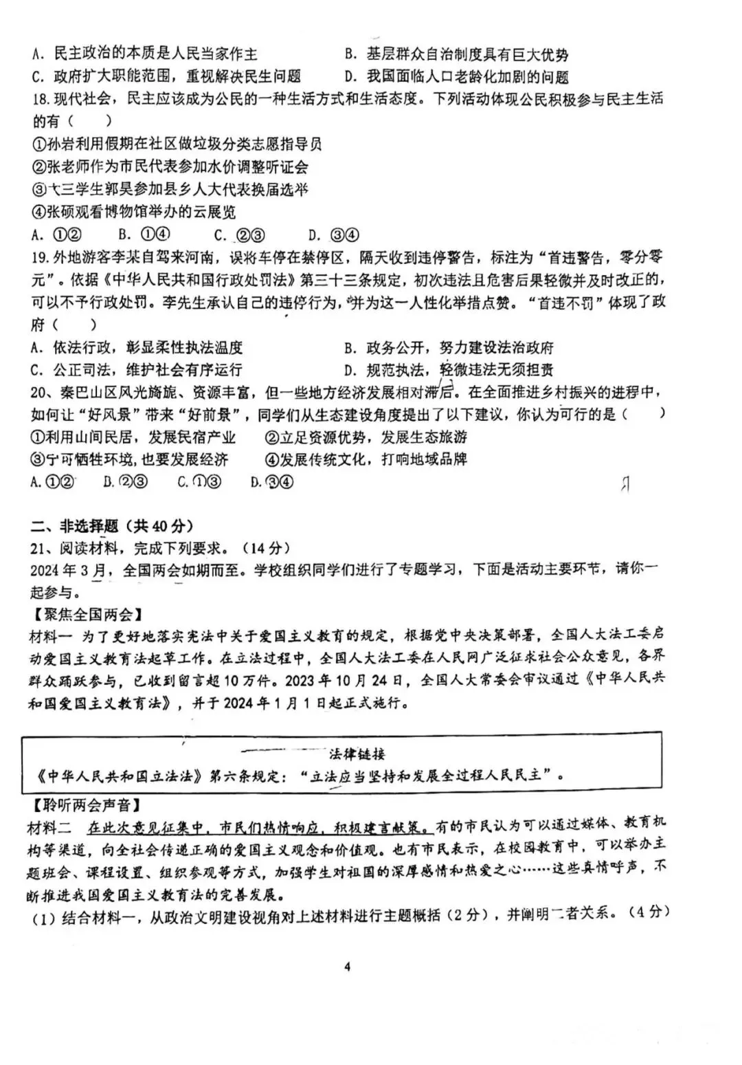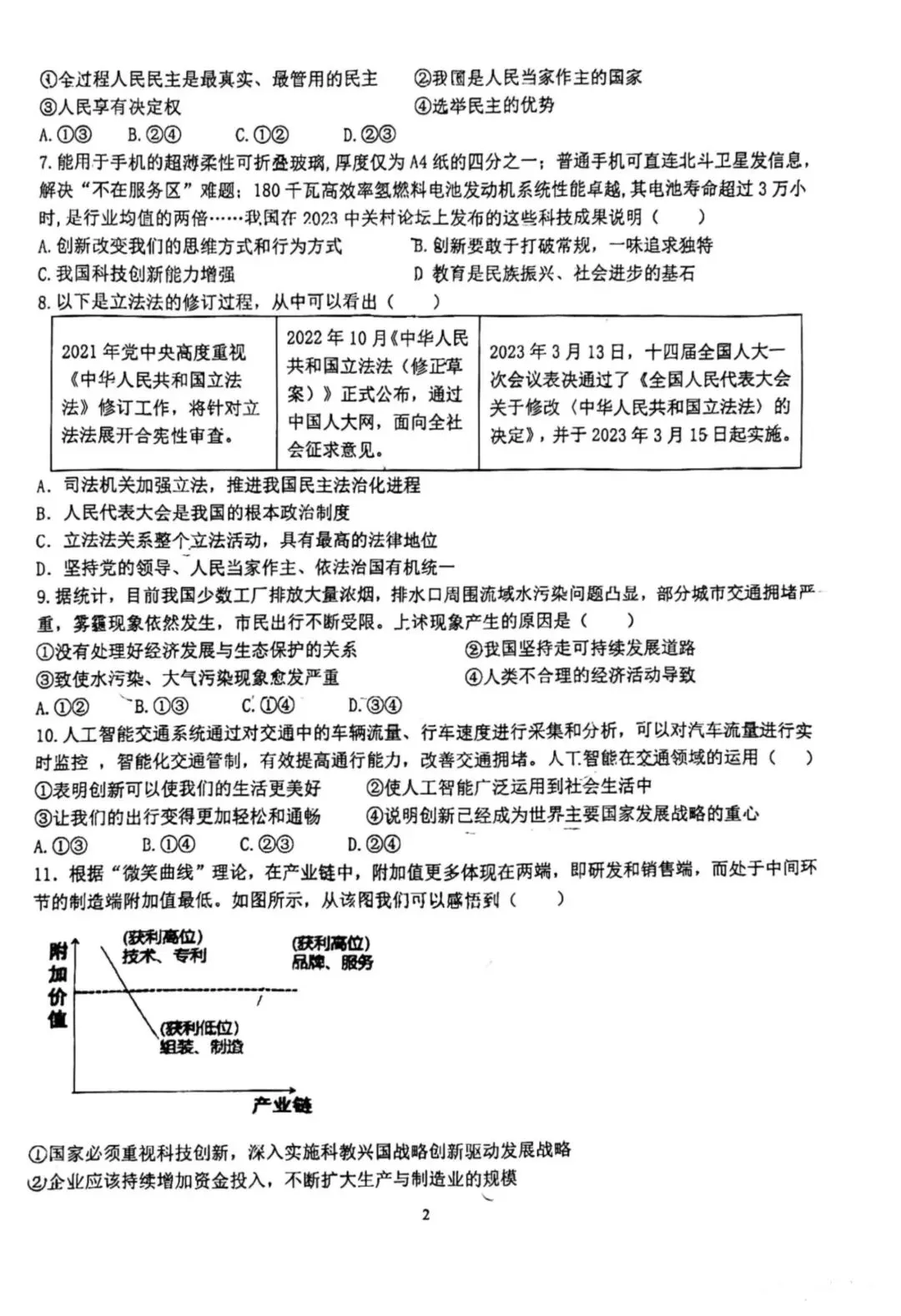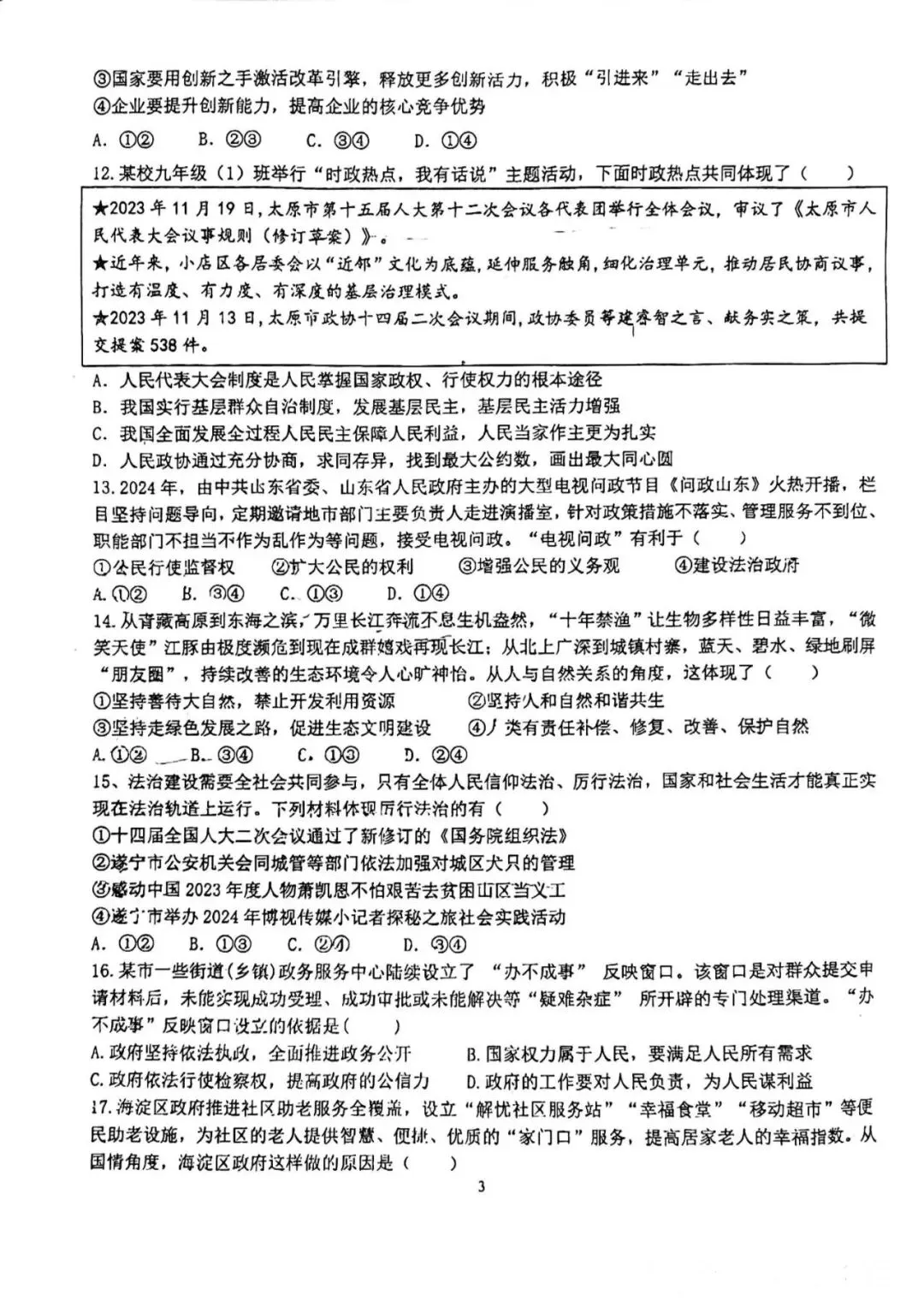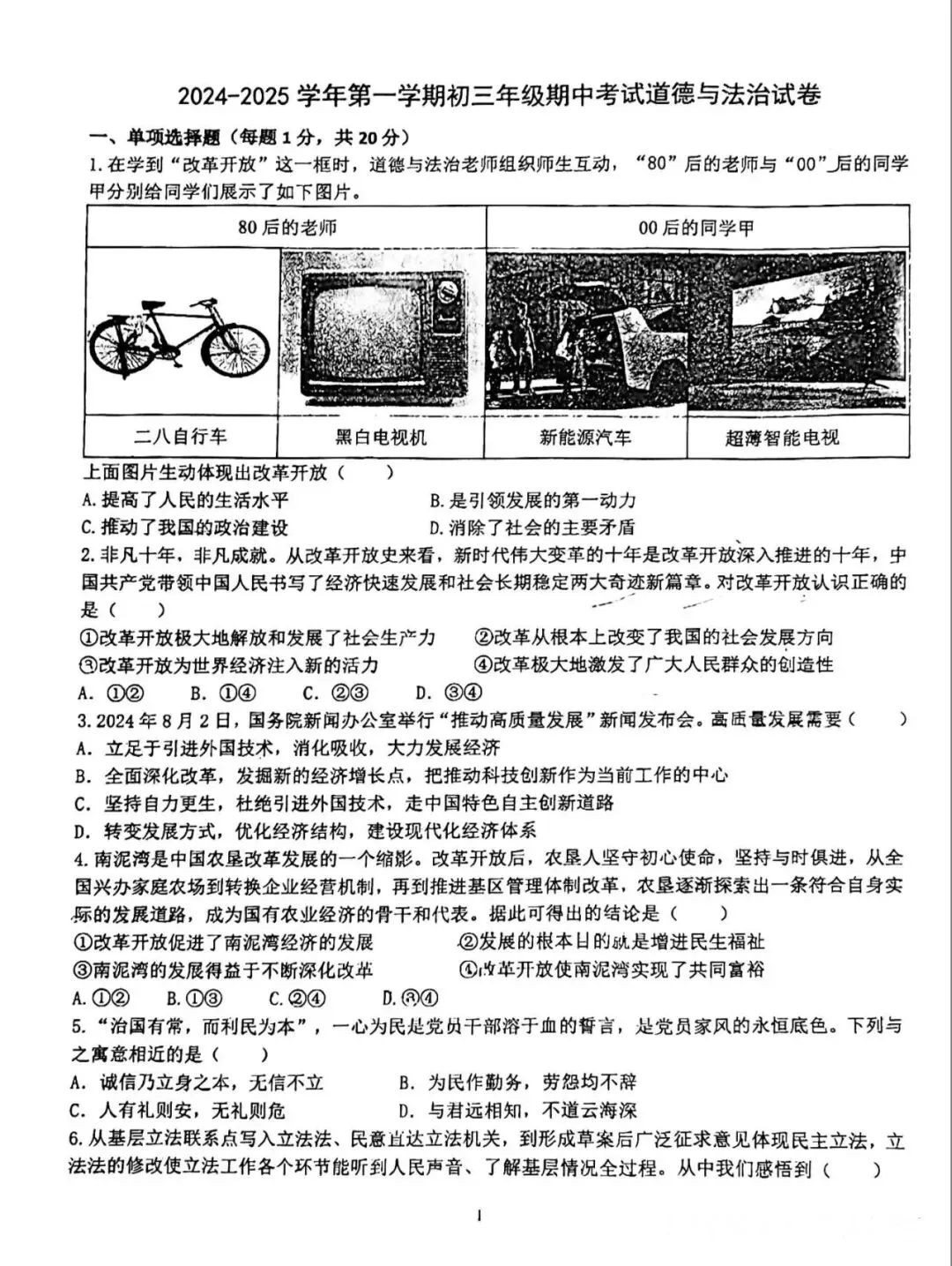 24年育华九年级上道法期中考试卷–可打印
