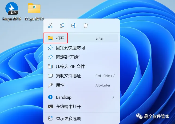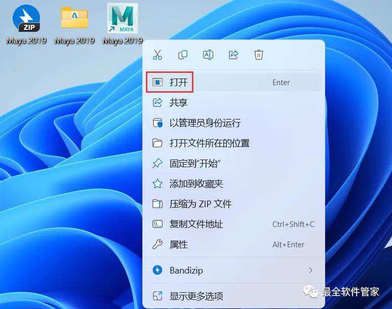 10、回到桌面,右键桌面上的【Maya 2019软件图标】,点击【打开】