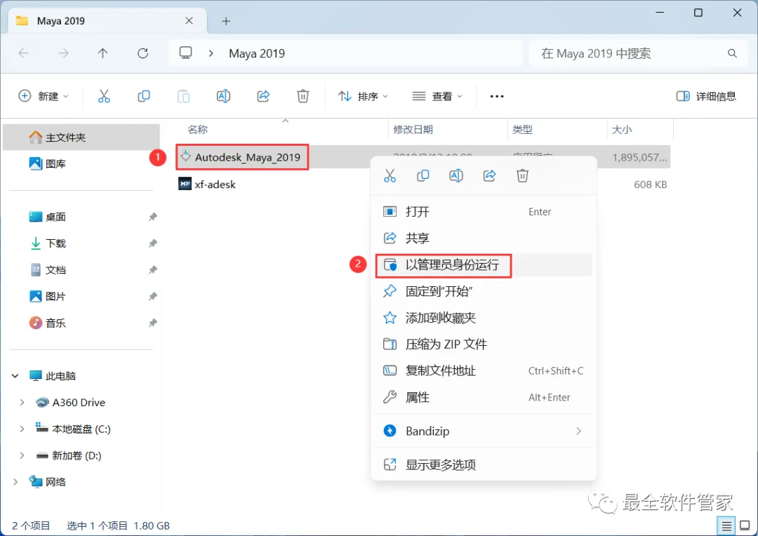 18、回到Maya 2019文件夹,找到【xf-adesk】程序,再右键选择【以管理员身份运行】它