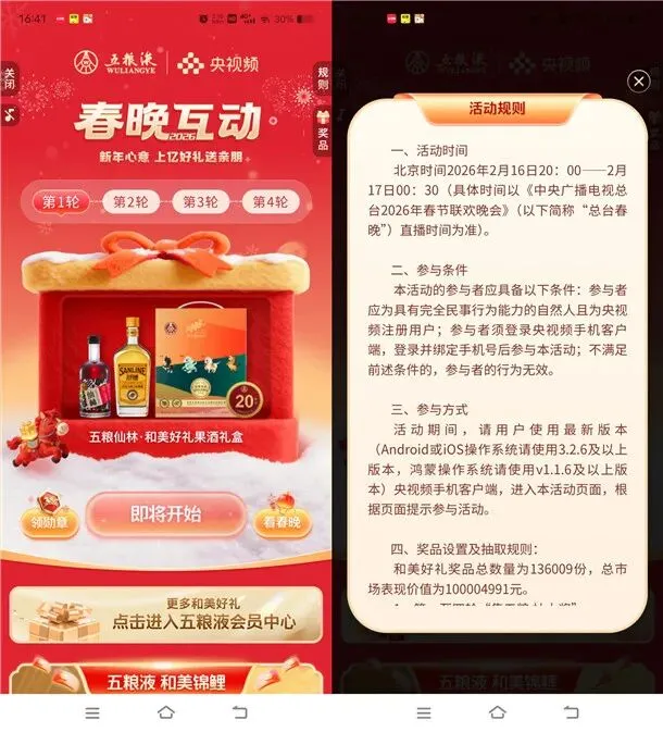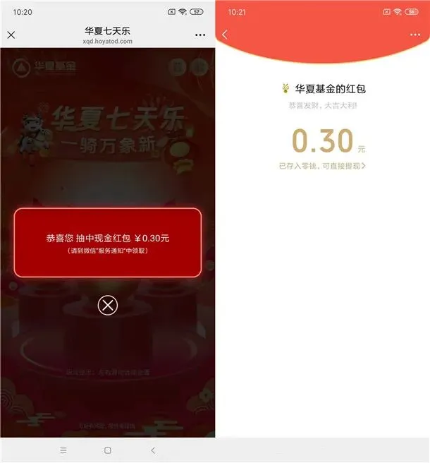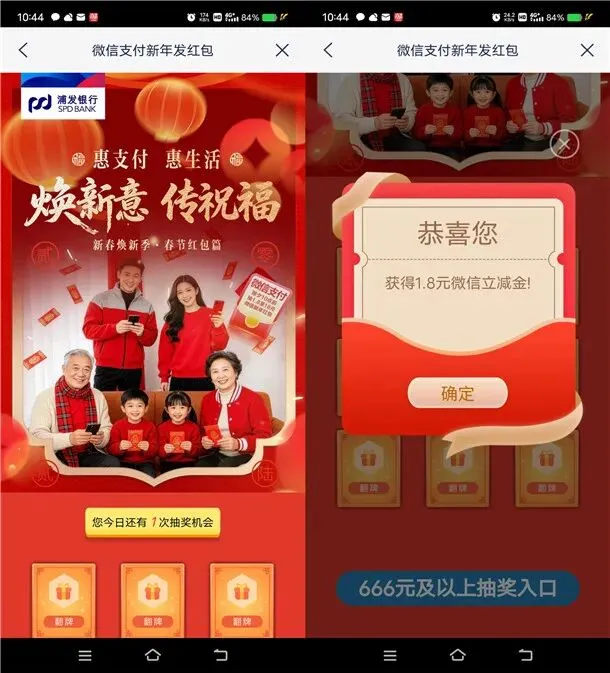 豆包APP春晚抽最高8888元现金红包+央视频春晚互动抽10万瓶五粮液 豆包APP新春活动抽最高8888元现金红包、实物 亲测中6.66元 参加豆包举办的豆包过年抽最高8888元现金红包活动,通过打开“豆包”APP,点左下角【豆包过年】进去,2月13日20点开始抽最高8888元现金红包、实物,除夕春晚当天还有多轮抽奖活动,可以重点关注一下这个活动。 活动时间 2026年2月13日-结束时间未知 今天除夕春晚会有多轮抽奖 参加方式 打开“豆包”APP,点左下角【豆包过年】进去,随便点击一个玩法抽奖,最高8888元现金红包、实物,刚中6.66元,除夕春晚当天还有多轮抽奖活动 央视频春晚互动今晚4轮抽10万瓶五粮液 每一轮数量限量 参加央视频举办的春晚互动抽10万瓶五粮液活动,通过打开“央视频”APP,点右侧图标【春晚互动】进去,今晚20:00-00:30听主持人口令抽10万份五粮液礼盒装,每一轮数量限量。 活动时间 2026年2月16日-结束时间未知 参加方式 打开“央视频”APP,点右侧图标【春晚互动】进去,今晚20:00-00:30听主持人口令抽10万份五粮液礼盒装 浦发银行新年发红包抽1.8-500元微信立减金 亲测中1.8元 参加浦发银行举办的新年发红包抽微信立减金活动,通过打开“浦发银行”APP搜索【微信支付新年发红包】进去,用微信转账66元给任意小号,支付方式选择浦发银行卡可以抽奖1次(二类电子卡也可以),转账666元给任意小号还可以抽1次,小编亲测刚中1.8元。 活动时间 2026年2月16日-3月5日 参加方式 打开“浦发银行”APP搜索【微信支付新年发红包】进去,用微信转账66元给任意小号,支付方式选择浦发银行卡可以抽奖1次(二类电子卡也可以),转账666元给任意小号还可以抽1次,刚中1.8元 华夏基金七天乐活动抽随机微信红包 亲测中0.3元秒推 参加华夏基金举办的七天乐抽红包活动,通过打开微信进去活动里,每天都有3次抽奖机会,砸蛋即可进行抽奖,有机会中到随机金额的微信红包,小编亲测刚中0.3元红包秒推,非必中。 活动时间 2026年2月16日-结束时间未知 参加方式 微信扫描下面二维码进去参加 小编提示:每天3次机会砸蛋抽奖,刚中0.3元,非必中 将公众号设为星标、置顶公众号,每天实时参加各种活动 以上活动内容均为互联网收集整理,如有侵权之处请联系我们删除处理 看都看完了,还不点这里试试