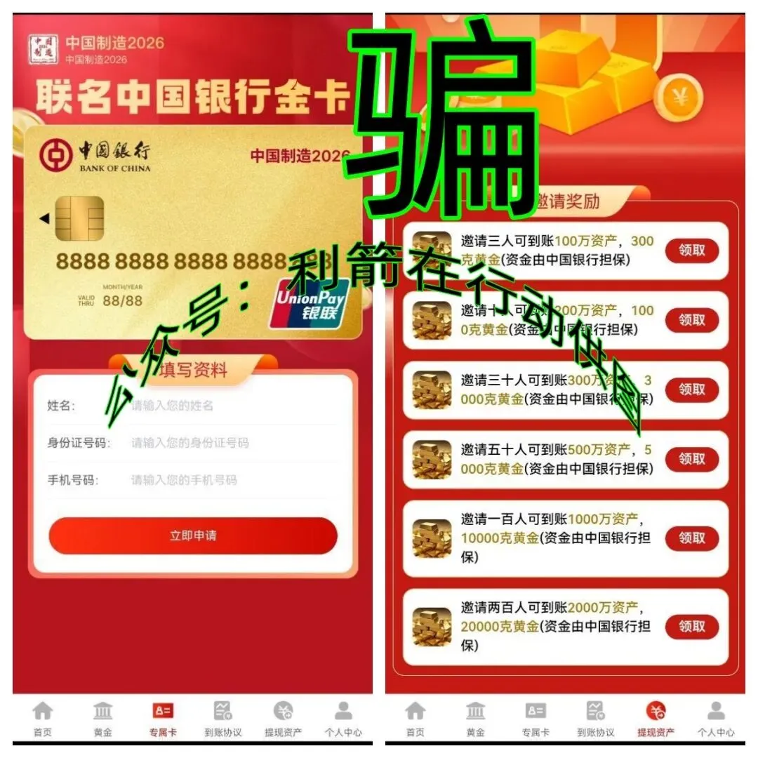 进入“中国制造2026”APP中,看到了要兑现的上千万元钱必须通过“联名中国银行金卡”才能到账,这些都是哄人的,是非法收集参与者身份信息的。