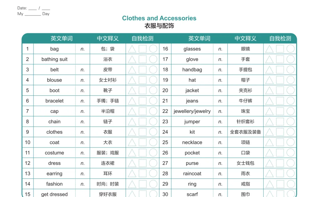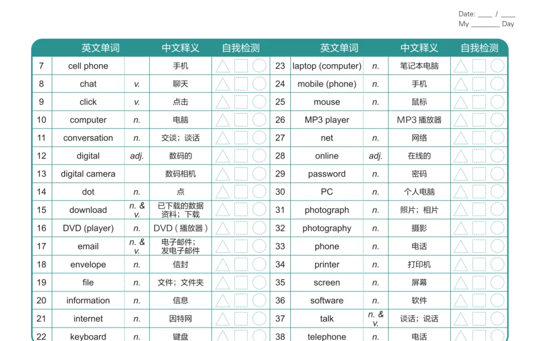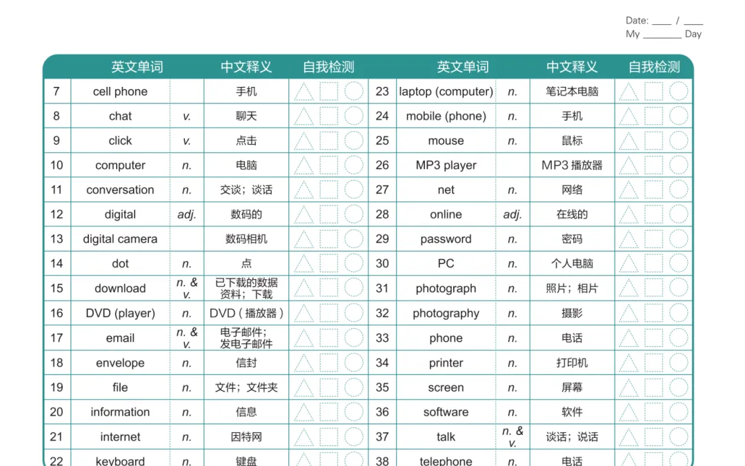 3️⃣ KET 词汇自检表(随时检测掌握程度,查漏补缺超方便)