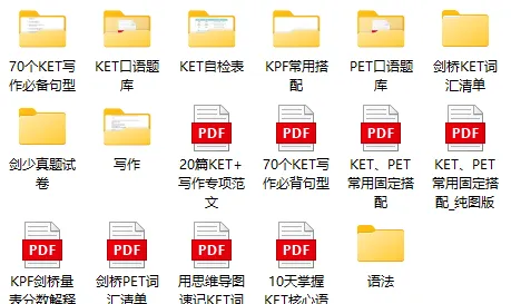 我们依据剑桥英语 KET 考试大纲,精准整理了全套备考核心资料包,涵盖词汇、语法、写作、听力、口语五大核心板块。这套「备考 + 能力」双效资料包 ,既能精准对接考试考点,又能同步提升英语能力。