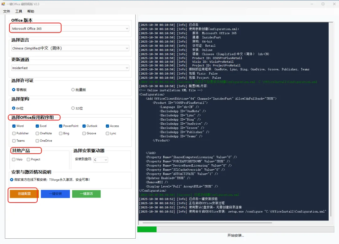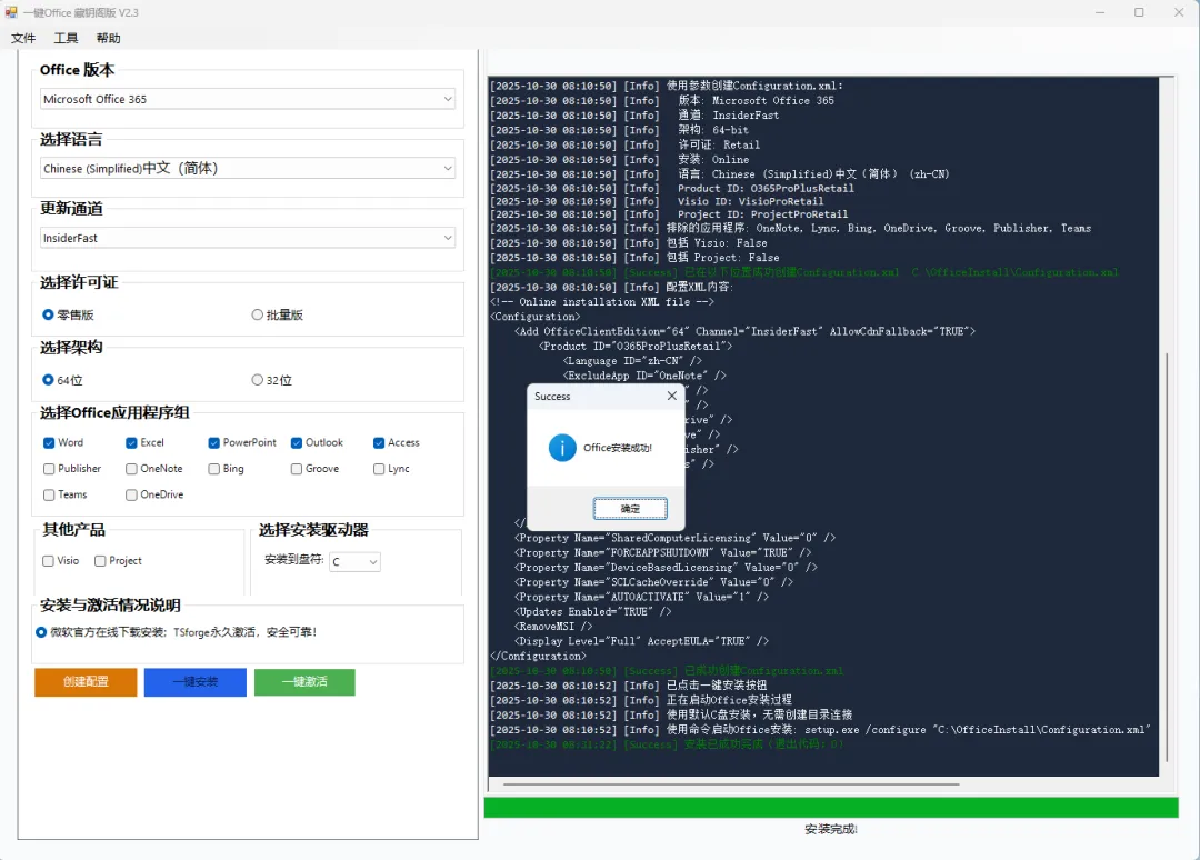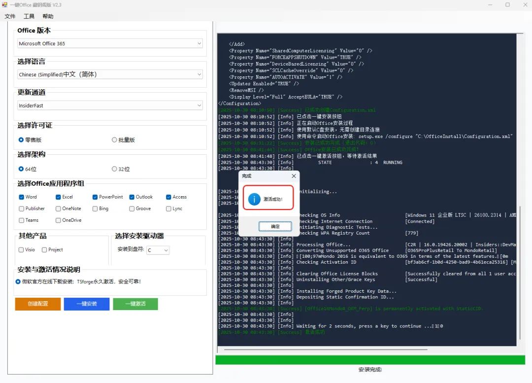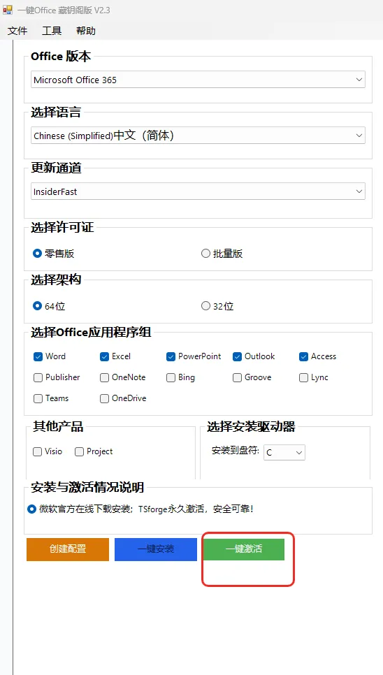 作为一款集安装与激活功能于一体的免费部署工具,它以 “极大简化流程” 为设计初衷,真正实现了 “一键操作” 的便捷体验。用户无需复杂设置,只需启动工具并选择所需的 Office 版本,软件便会自动完成安装包匹配、部署安装以及激活验证的全流程,全程无需人工干预。