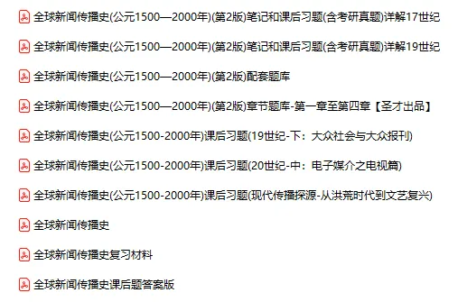今天分享的资料是「0490-全球新闻传播史」电子版+学习笔记+知识点总结+期末考试重点+复习资料+习题集及答案+名词解释+历年真题试卷及答案+题库及答案+复习重点+思考题及参考答案+公式总结+考试重点基础题+知识总结+高清PDF可打印+免费分享!