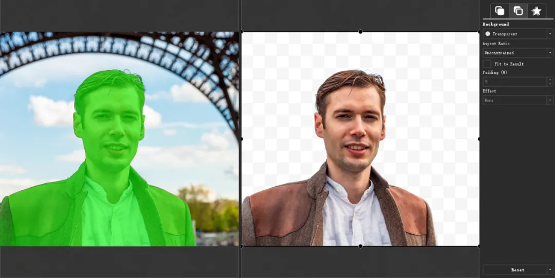 添加图片时,软件会自动加载图片,自动识别人物和背景,并将人物进行涂选,它帮你去除了背景。结果显示在窗口的右侧。
