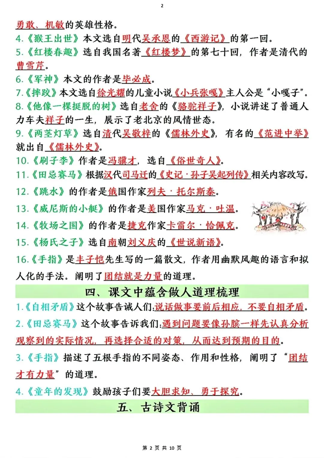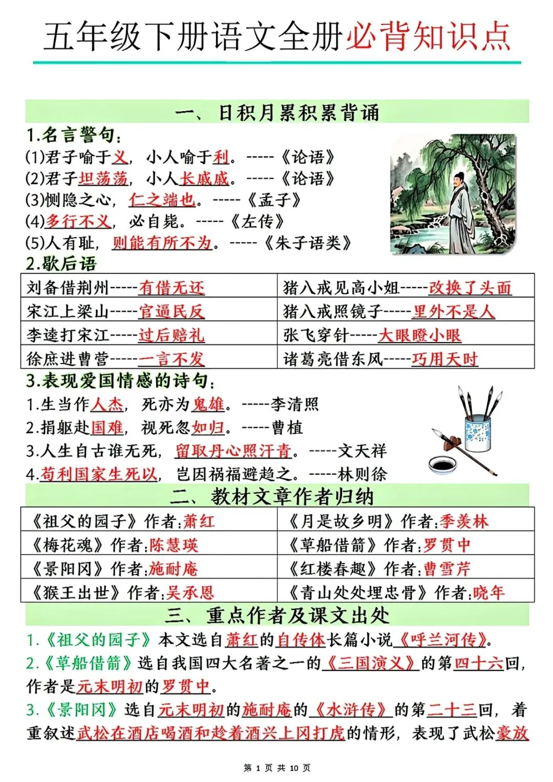 【免费下载】五年级下语文全册必背知识点,PDF电子版,共10页,可打印