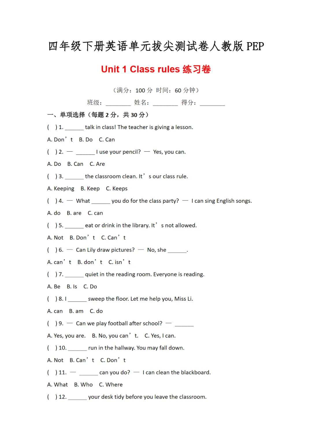 【免费下载】四年级(下)英语 26春Unit 1 练习卷《人教版PEP》,PDF电子版,共18页,可打印
