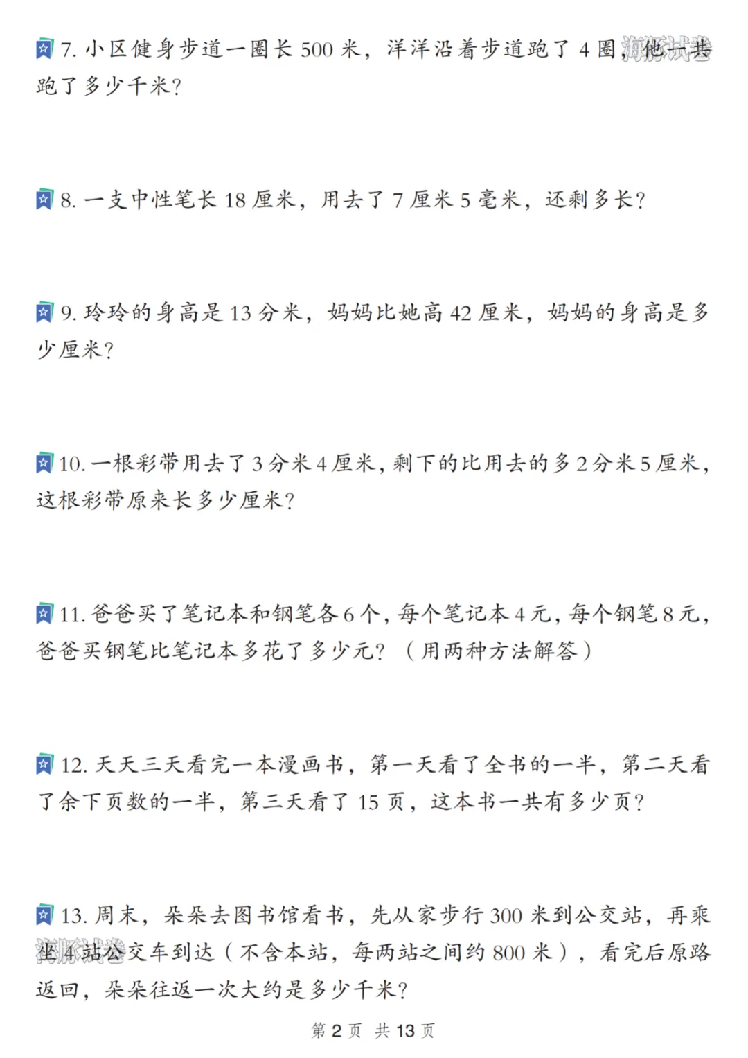 【免费下载】三年级(上)数学寒假重点应用题专项复习,PDF电子版,共13页,可打印