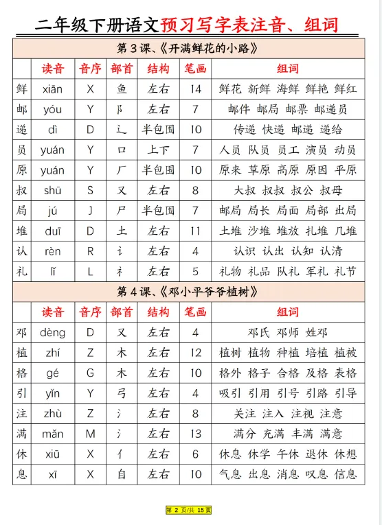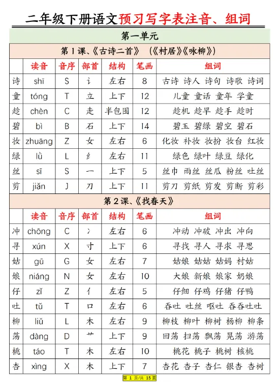 新二年级下册语文预习生字注音组词,电子版可打印