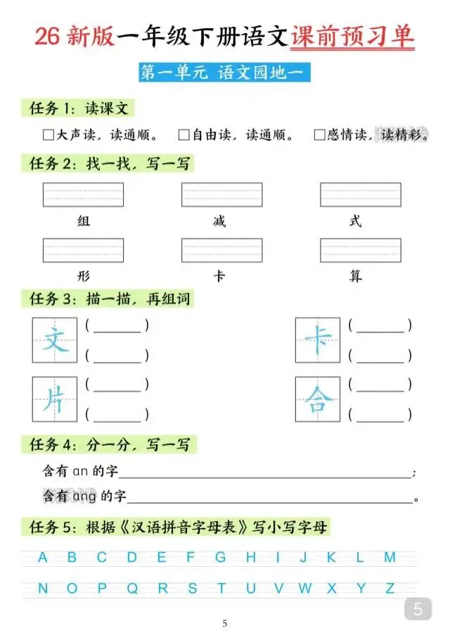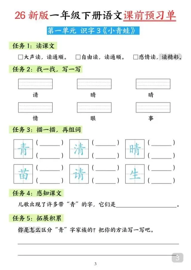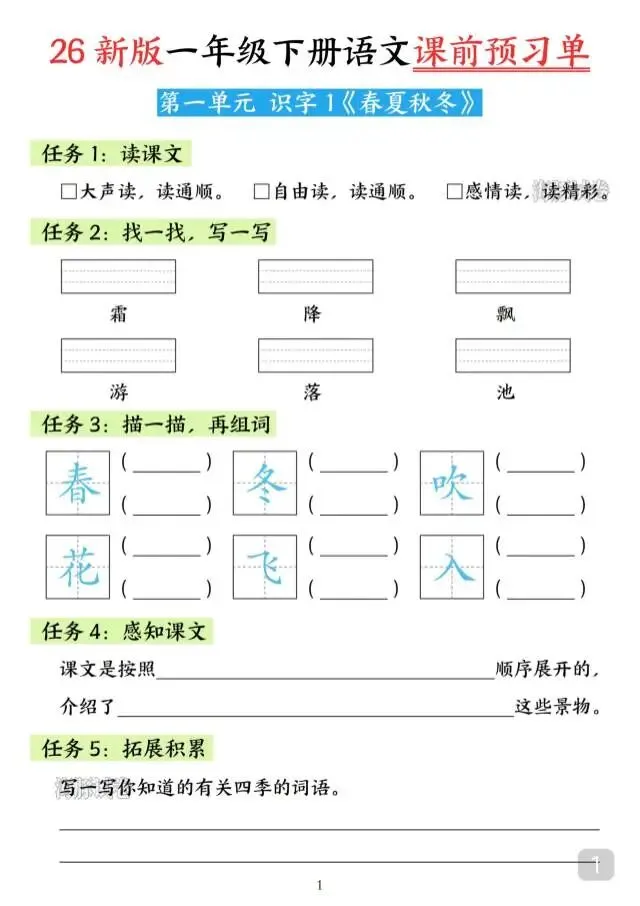 这份一年级下册语文第一单元课前预习单,紧扣课本识字篇目编排,每课设置读文、写字、组词、感知课文、拓展积累五大阶梯式任务,层层引导孩子开展自主预习,既夯实生字词基础,又培养阅读理解和知识拓展能力。编排贴合低年级学习特点,任务清晰、操作简单,是孩子课前预习、衔接新学期语文学习的实用好帮手!需要的家长抓紧打印出来吧!