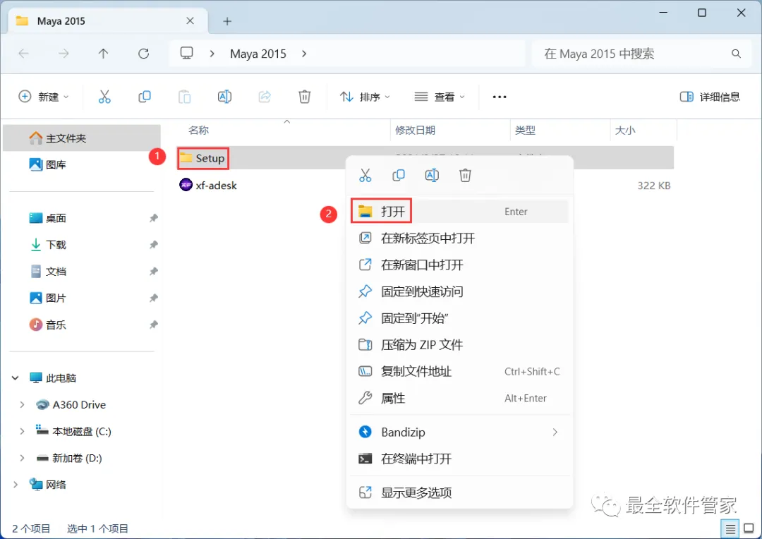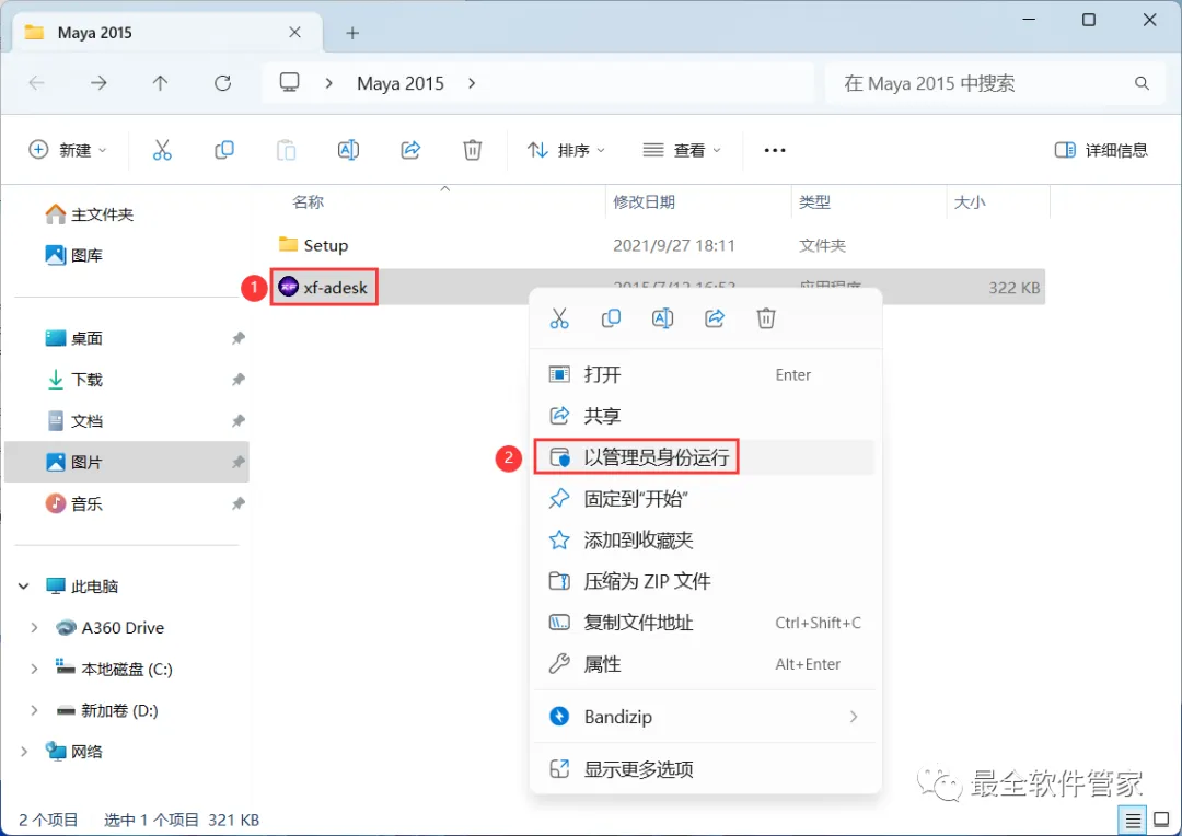 17、回到Maya 2015文件夹,找到【xf-adesk】程序,再右键选择【以管理员身份运行】它