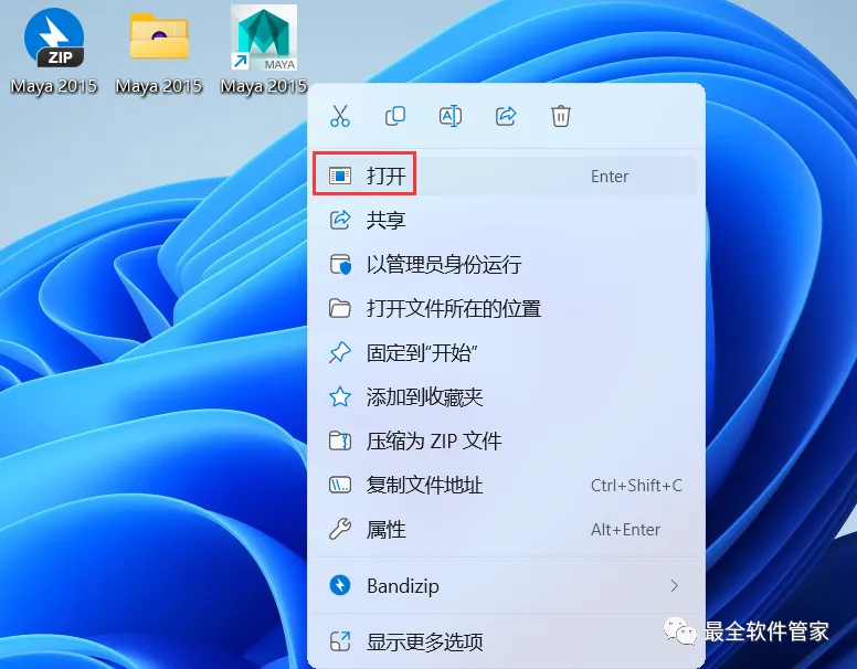 11、回到桌面,右键桌面上的【Maya 2015软件图标】,点击【打开】
