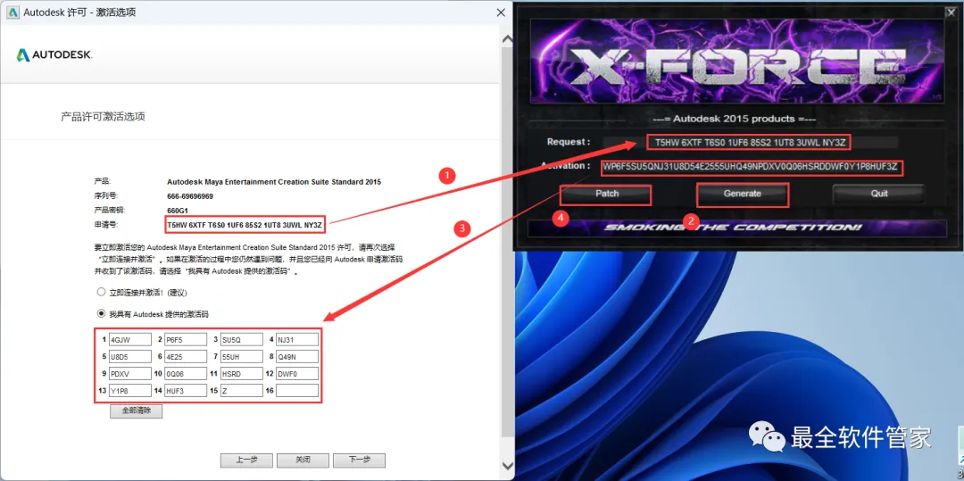 18、打开软件界面,将软件的【申请号】填入到程序的【Requset】内,再点击【Generate】,将程序的【Activation】填入到软件的【激活码】内,再点击【Patch】