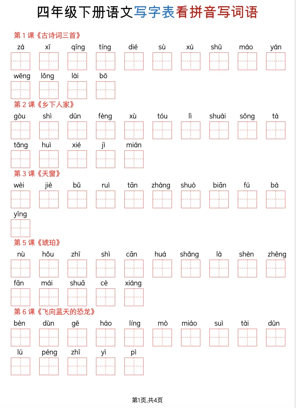 四年级下册语文《写字表生字默写单》,电子版下载打印(共8页附答案) ,生字没有什么太多的技巧,不懂多问字典,课本。