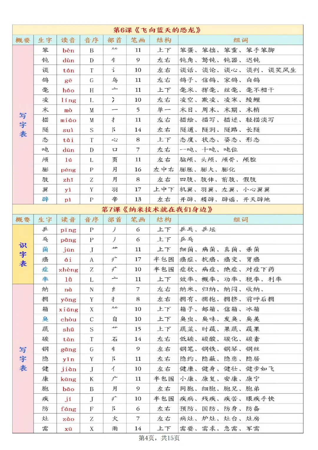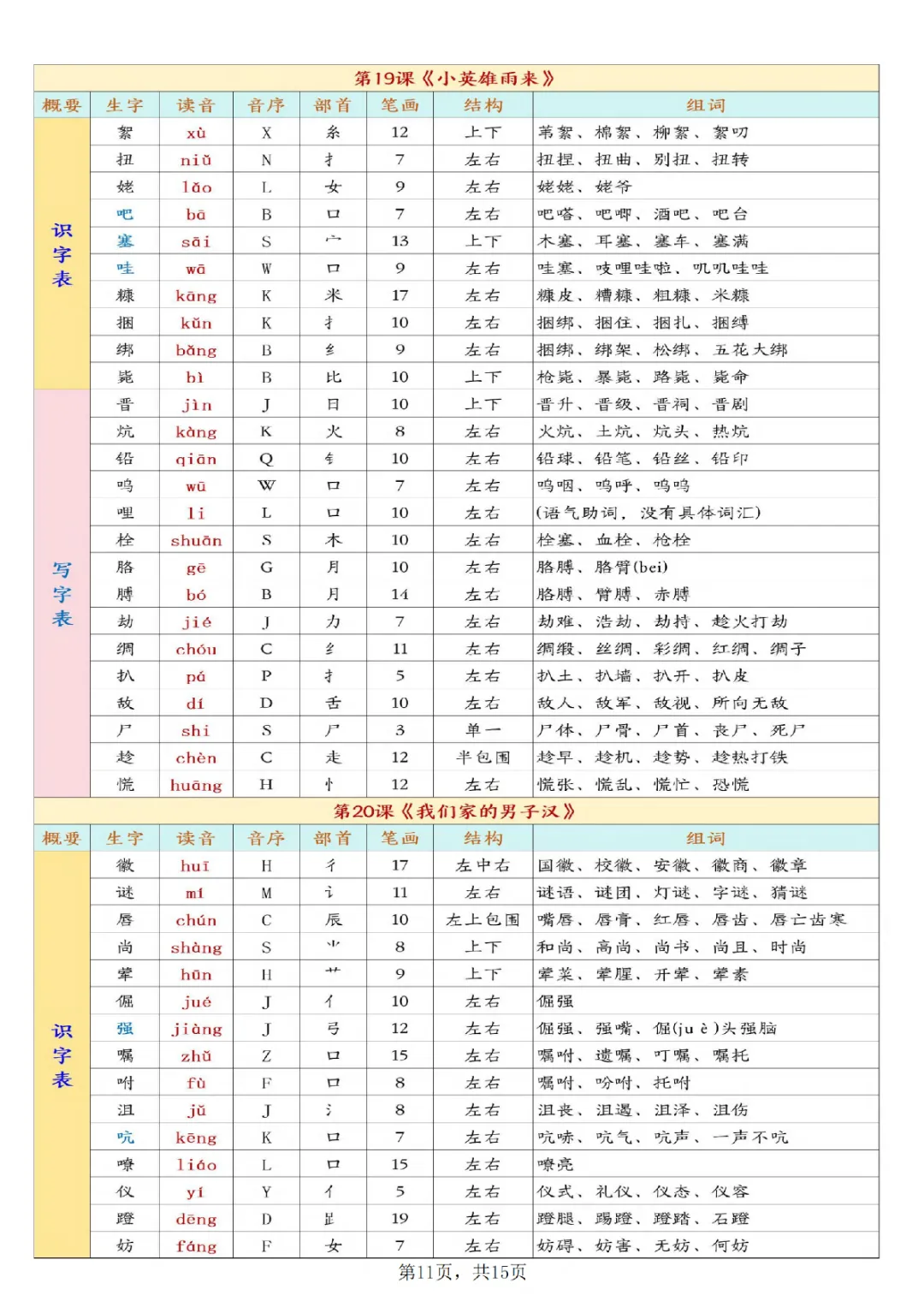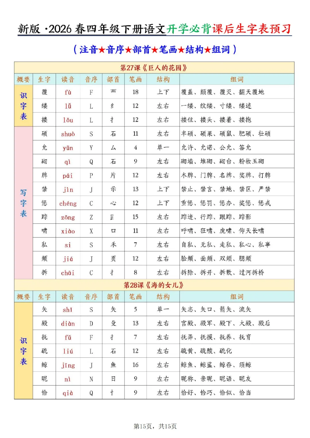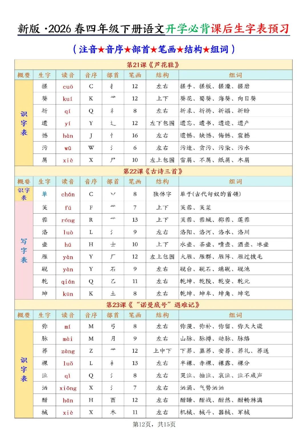一年级下册语文开学必背课后生字表预习(生字拼音部首结构组词)|电子版可打印