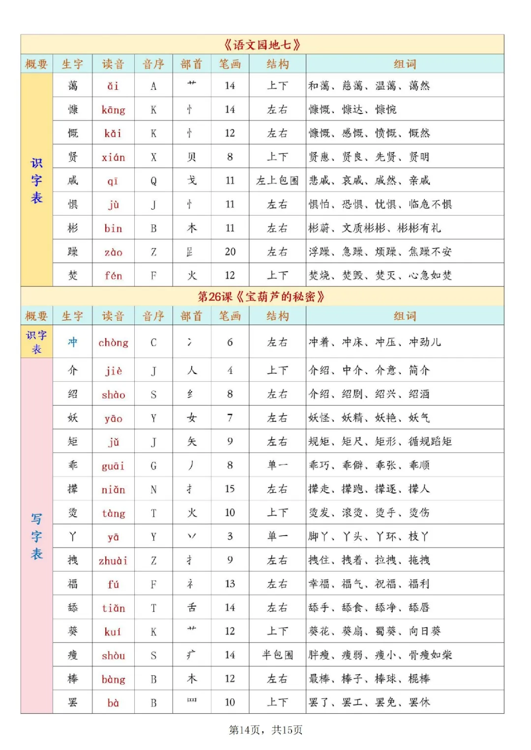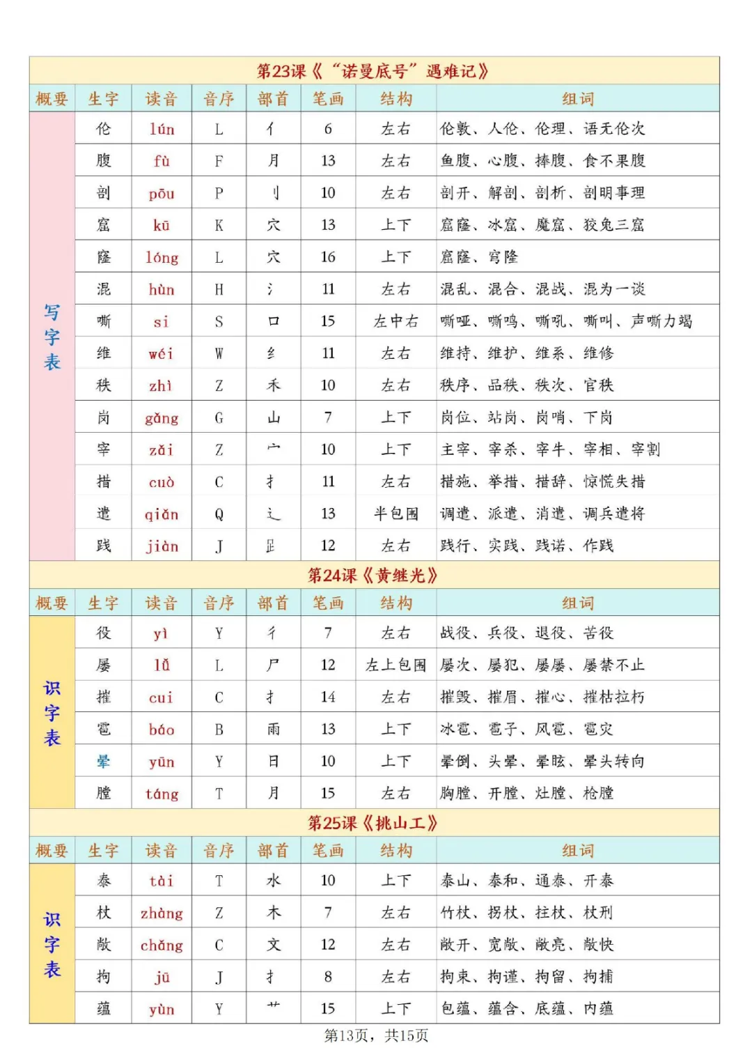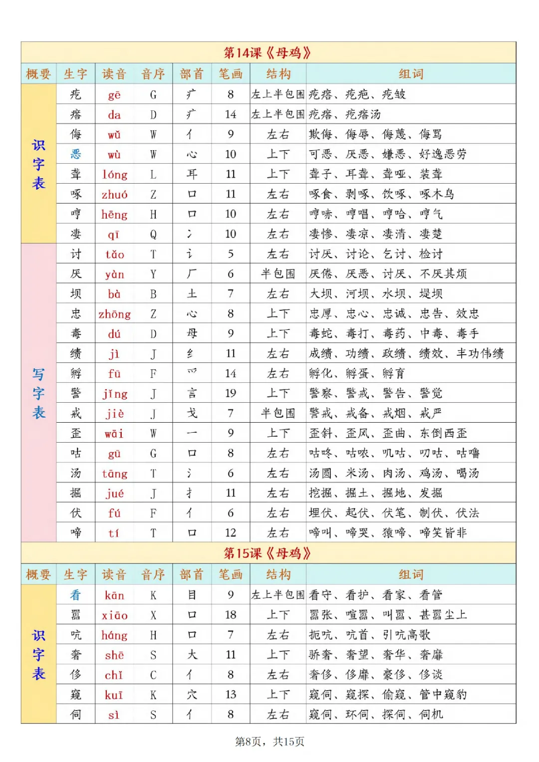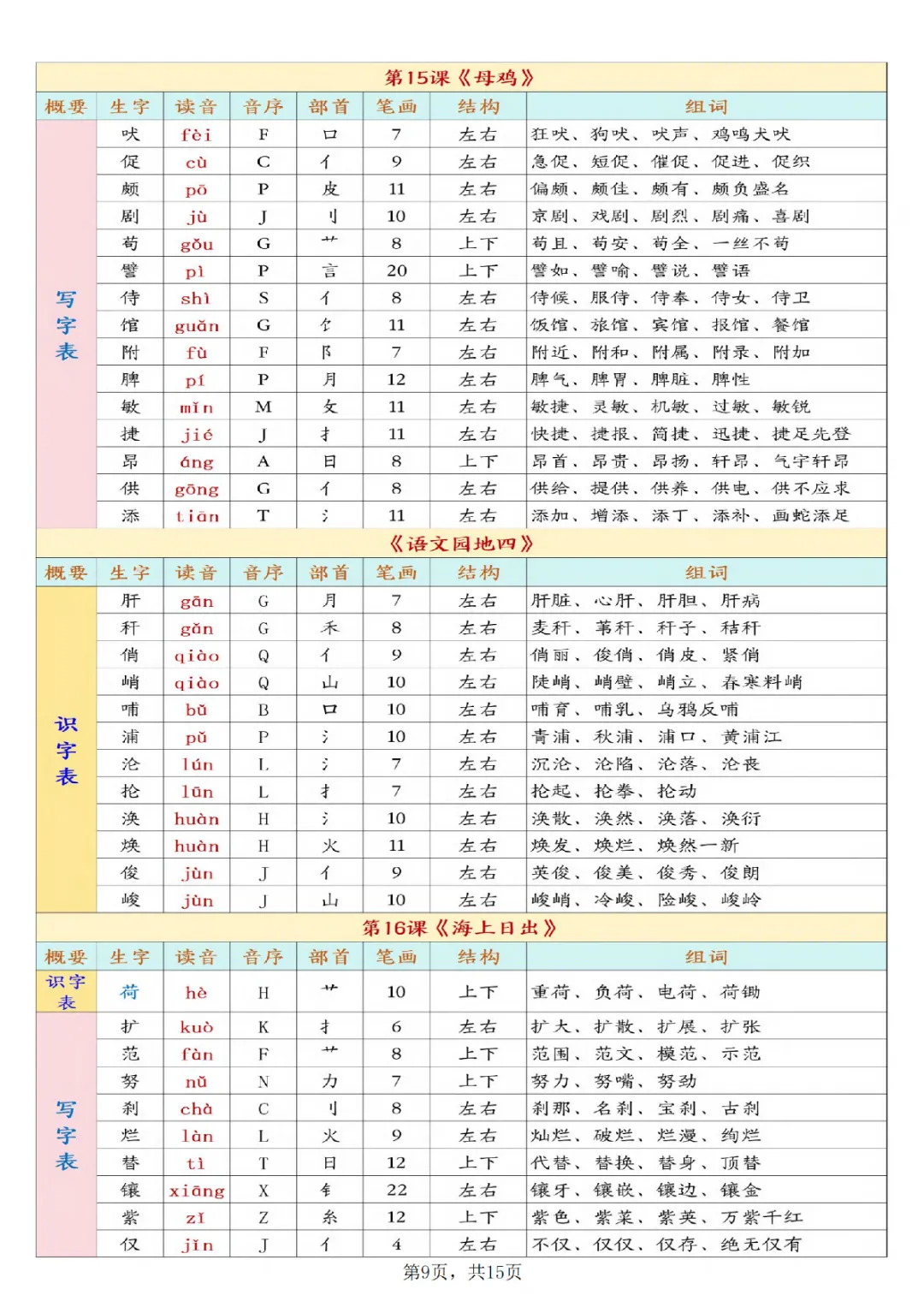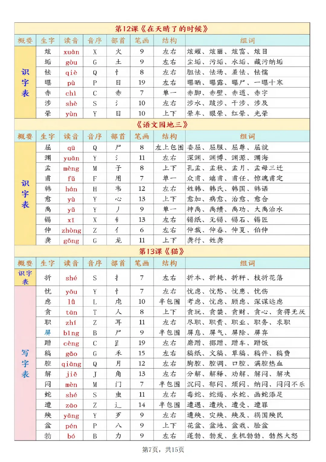 一年级下册语文开学必背课后生字表预习(生字拼音部首结构组词)|电子版可打印