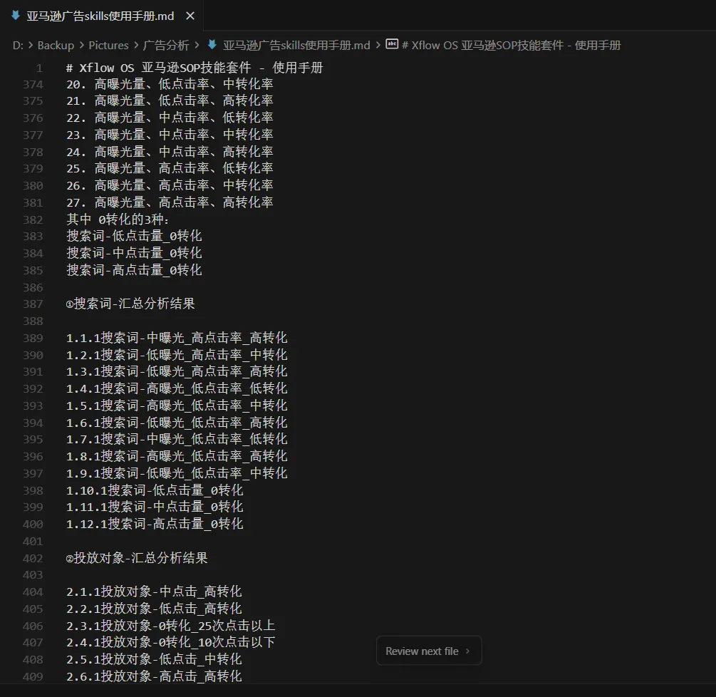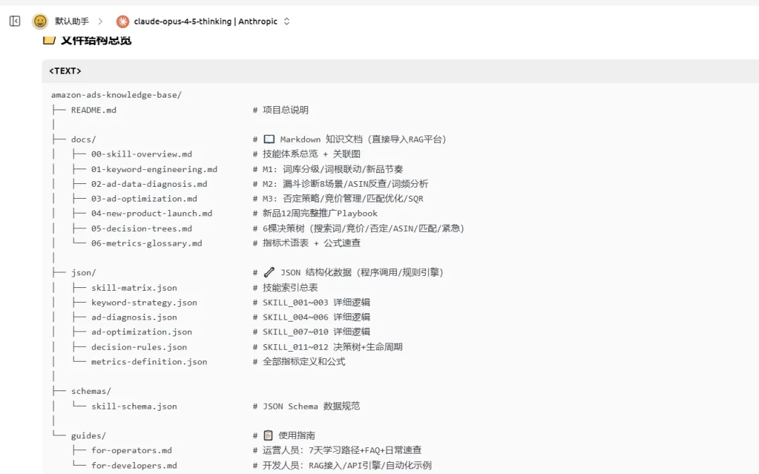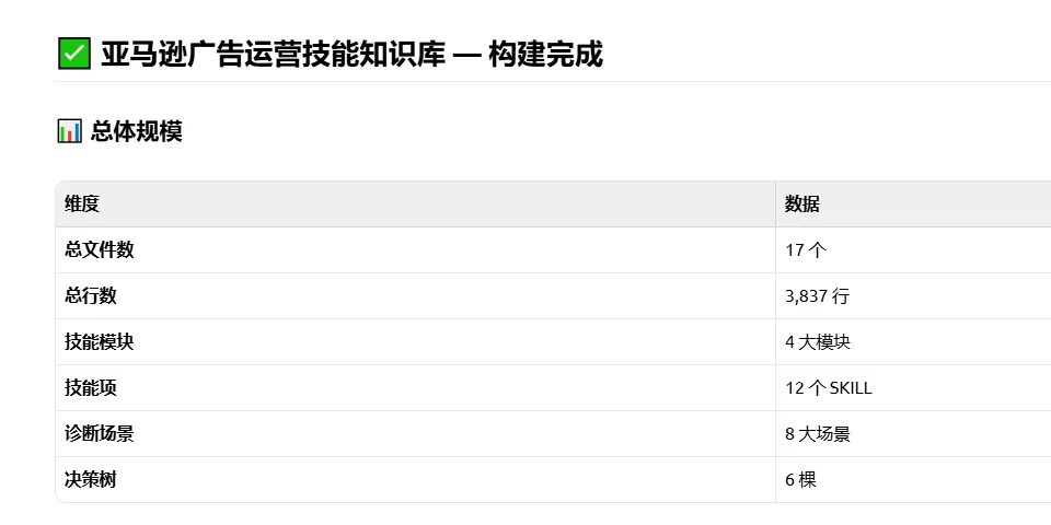 amazon-ads-knowledge-base/├── docs/ # 核心知识文档 (Markdown)│ ├── 01-keyword-engineering.md # 关键词分层与分级体系│ ├── 02-ad-data-diagnosis.md # 漏斗模型与八大诊断场景│ ├── 03-ad-optimization.md # 竞价调整与搜索词处理SOP│ ├── 04-new-product-launch.md # 新品三阶段推广全流程│ ├── 05-decision-trees.md # 决策决策树(DT1-DT4)│ └── 06-metrics-glossary.md # 指标定义与底层逻辑├── json/ # 结构化规则数据 (JSON)│ ├── keyword-strategy.json # 关键词分类逻辑│ ├── ad-diagnosis.json # 场景诊断触发规则│ ├── decision-rules.json # 决策树逻辑与阈值│ └── metrics-definition.json # 计算公式与 Benchmark├── guides/ # 面向不同角色的使用手册│ ├── for-operators.md # 【已生成】运营人员速查手册│ └── for-developers.md # 【已生成】开发与 AI 集成指南└── schemas/ # 数据规范 └── skill-schema.json # 技能数据结构定义