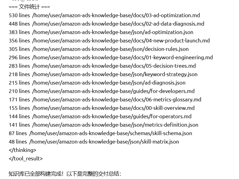 《亚马逊广告知识库》核心指南文件的创建。该知识库的完整文件结构验证及核心内容概览。