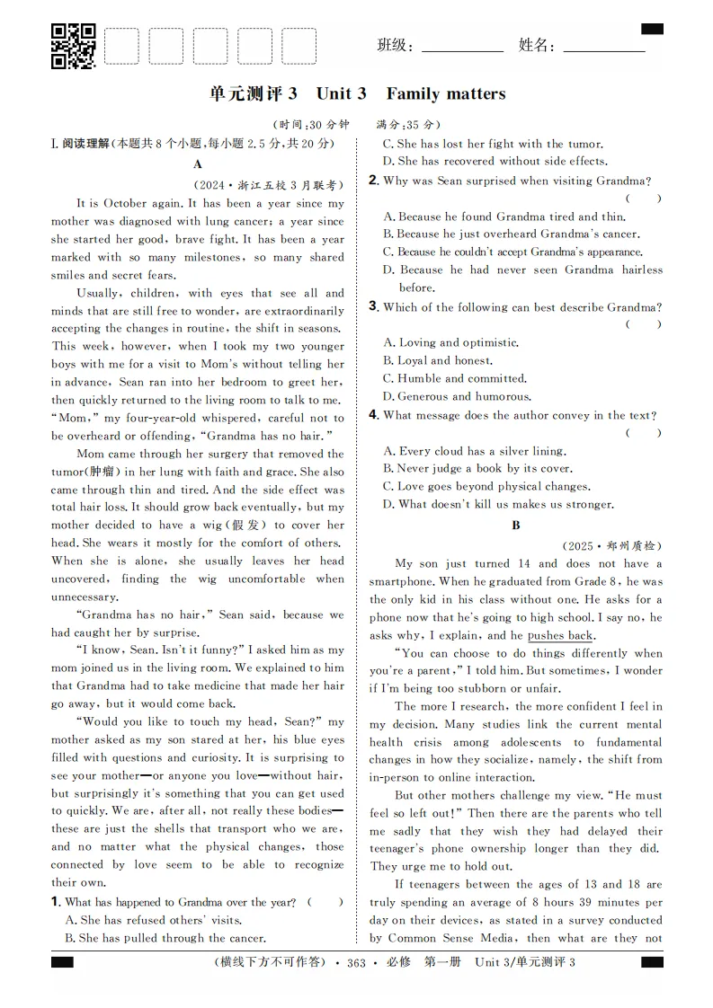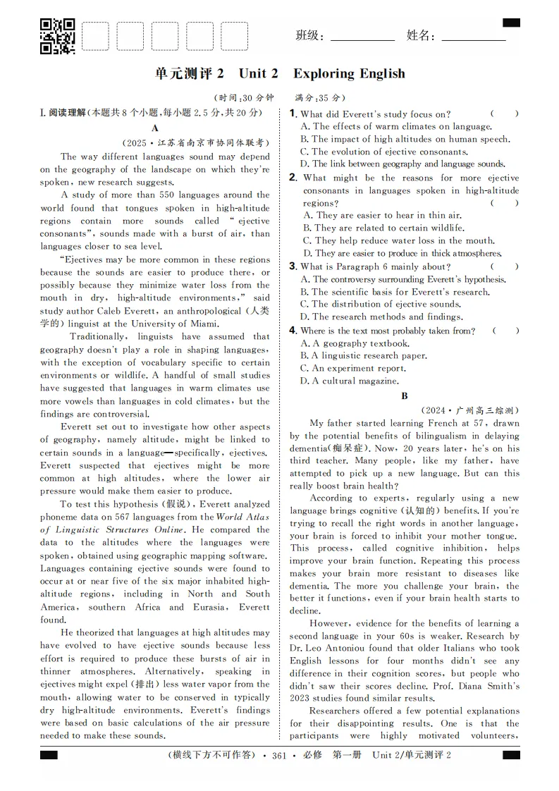 2023-2024届人教2019版英语必修第一册思维突破合订本(共68页word版)
