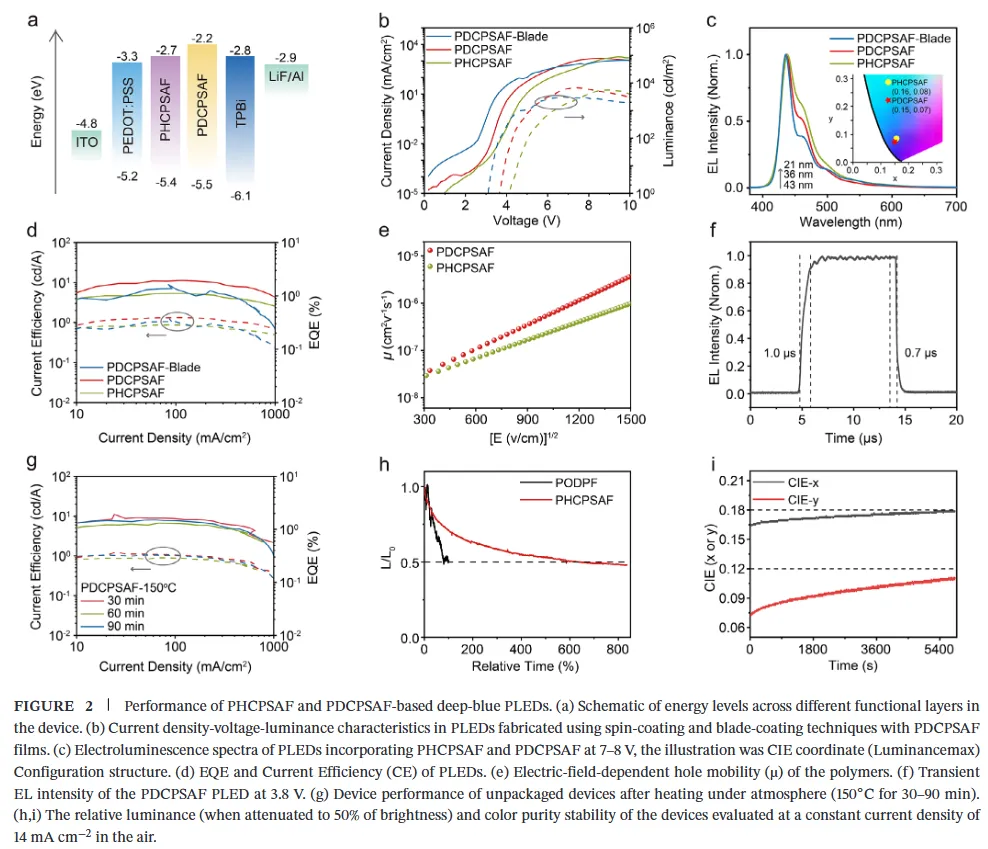 高性能深蓝光OLED:PDCPSAF基器件外量子效率达1.94%,半高宽仅21 nm,CIE坐标(0.15,0.06)接近BT.2020深蓝光标准,亮度6698 cd/m²,且具有优异的热稳定性和电化学稳定性,150°C加热90分钟仍保持性能。