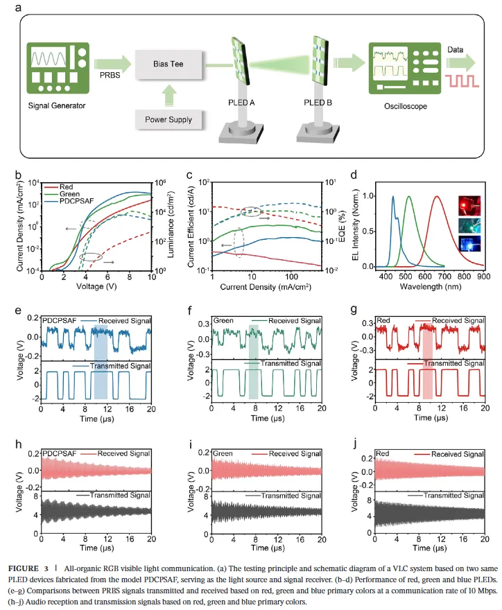 全有机RGB可见光通信系统首次演示:利用同一材料既可发光又可检测的特性,搭建了基于RGB三原色的全有机可见光通信系统,成功实现1 Mbps速率下伪随机二进制序列和音频信号的传输,验证了可打印OLED在光通信中的实用潜力。