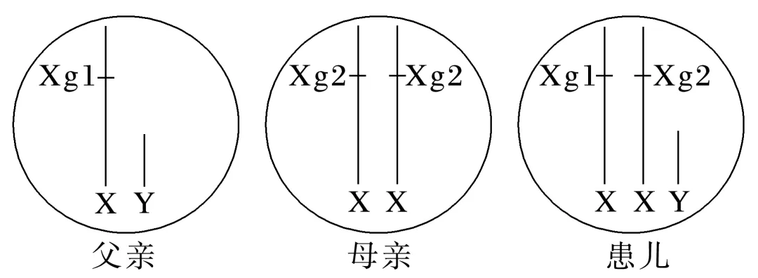 解析 分析题图可知,Xg1和Xg2为X染色体上的等位基因,由于父亲的基因型为XXg1Y,母亲的基因型为XXg2XXg2,患儿的基因型为XXg1XXg2Y,所以该患儿的XXg2染色体来源于母亲,XXg1和Y两条性染色体均来源于父亲。