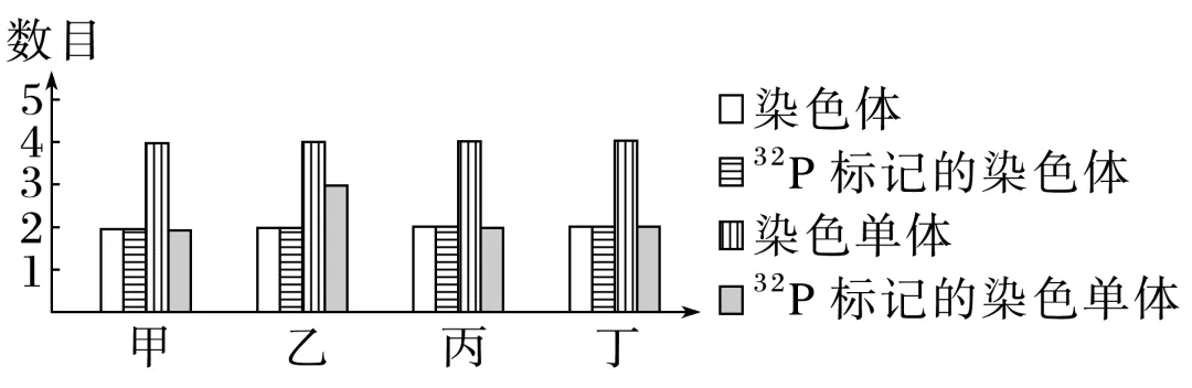 3.(2024·浙江6月选考,18)某二倍体动物(2n=4)精原细胞DNA中的P均为32P,精原细胞在不含32P的培养液中培养,其中1个精原细胞进行一次有丝分裂和减数分裂Ⅰ后,产生甲~丁4个细胞。这些细胞的染色体和染色单体情况如图所示。不考虑染色体变异的情况下,下列叙述正确的是( )