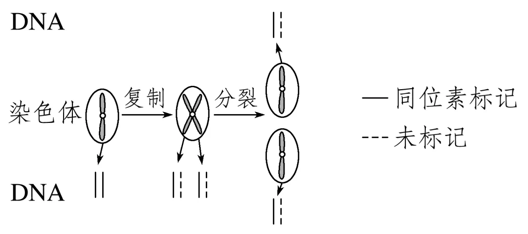利用放射性同位素标记所有的DNA分子,并将该细胞置于不含放射性标记的培养液中培养,解决DNA复制过程中染色体标记的问题的关键是构建细胞分裂过程模型图,并完成染色体与DNA的转换,转换图示例如下:
