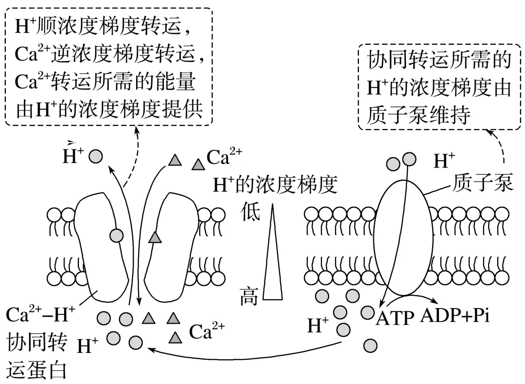 例如:细胞膜上Na+-H+协同转运蛋白输出H+的同时伴随Na+输入细胞,H+的输出由Na+浓度梯度驱动 |