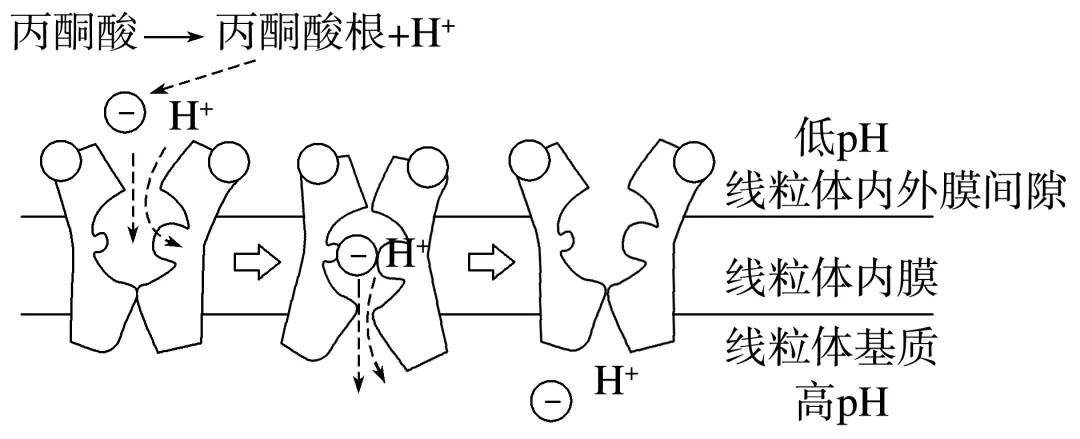 解析 MPC功能减弱会抑制丙酮酸进入线粒体,就会有更多的丙酮酸在细胞质基质中进行无氧呼吸,导致产生更多的乳酸,则动物细胞中乳酸积累将会增加,A正确;结合题图可知,丙酮酸分解形成丙酮酸根和H+,两者共同与MPC结合使MPC构象改变,从而运输丙酮酸根和H+,B正确;结合题图可知,H+会协助丙酮酸根进入线粒体,pH的变化受H+浓度的影响,因此线粒体内外膜间隙pH变化影响丙酮酸根转运速率,C正确;丙酮酸根的运输需要MPC的参与,且需要H+电化学梯度(H+浓度差)提供能量,因此丙酮酸根的运输速率受MPC的数量及H+浓度的影响,并不是线粒体内膜两侧的丙酮酸根浓度差越大其转运速率越高,D错误。