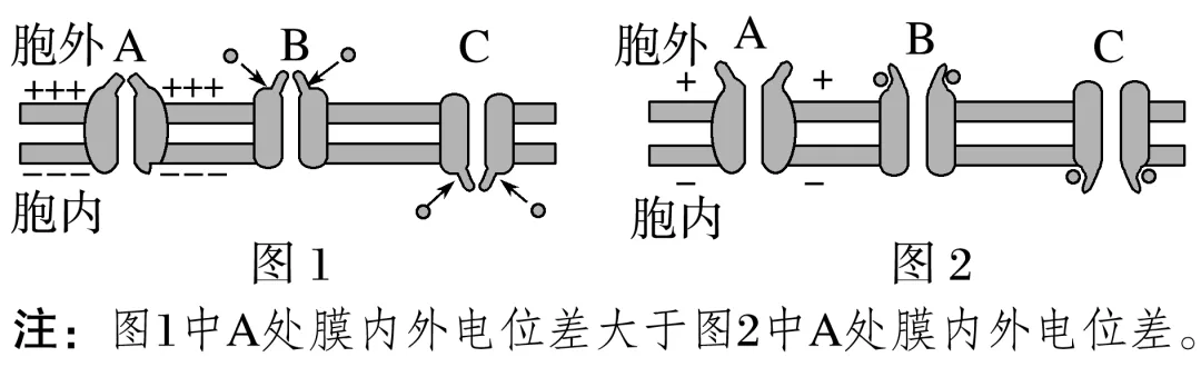 2.(2025·长沙一中阶段检测)由通道蛋白形成的离子通道包括电压门通道和配体门通道。在电压门通道中,带电荷的蛋白质结构域会随膜电位的改变而发生相应的移动,从而使离子通道开启或关闭。在配体门通道中,细胞内外的某些小分子配体与通道蛋白结合,继而引起通道蛋白开启与关闭。图1中A、B、C通道处于关闭状态,图2中A、B、C通道处于开启状态,据图判断,下列叙述错误的是( )