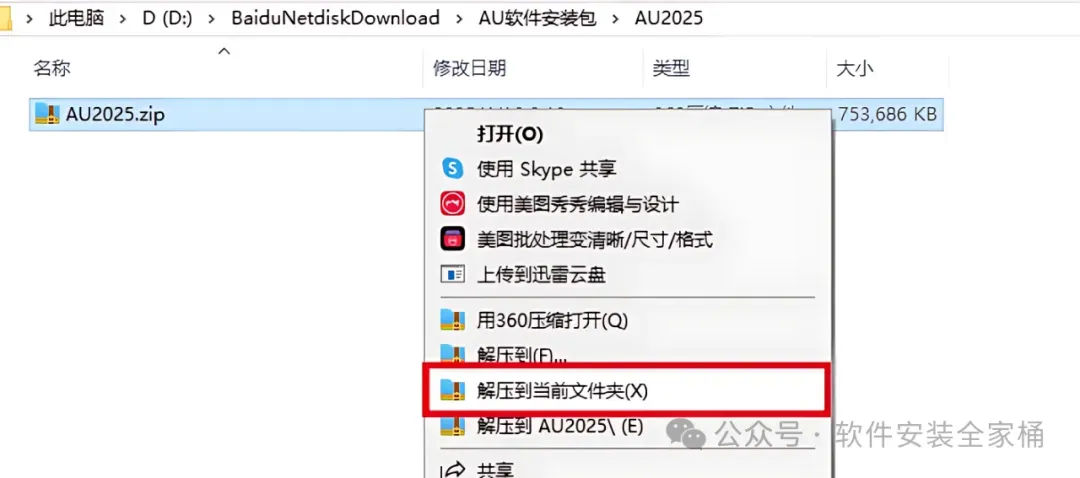 1.打开下载的Audition软件安装包,鼠标右击压缩包选择【解压到当前文件夹】。
