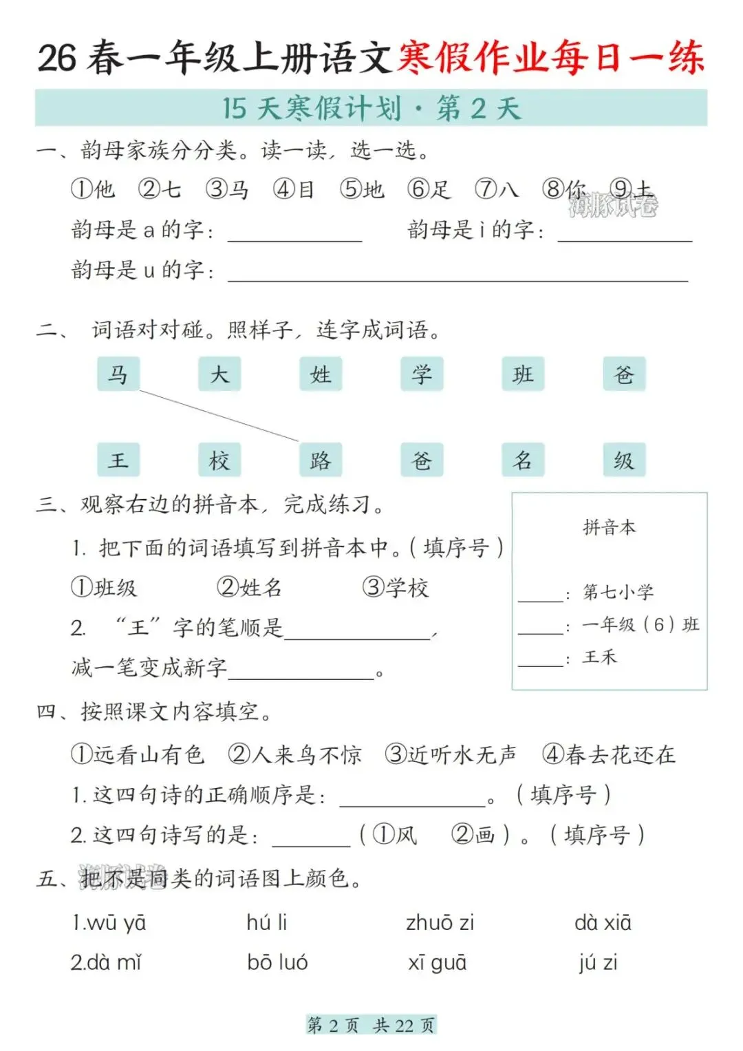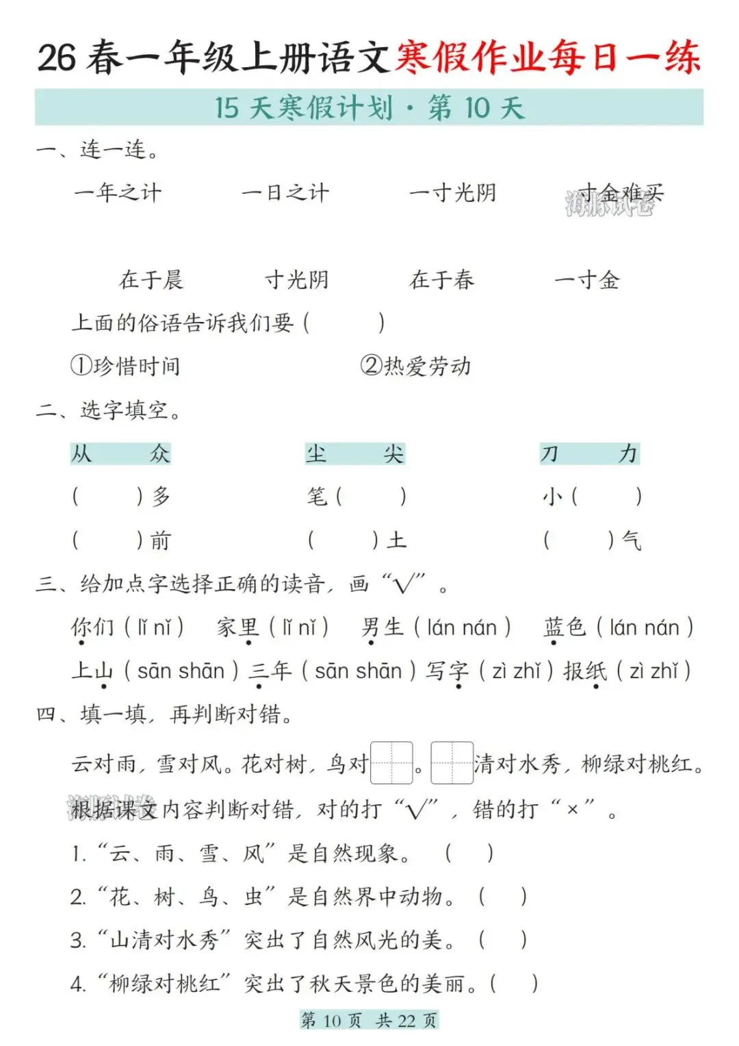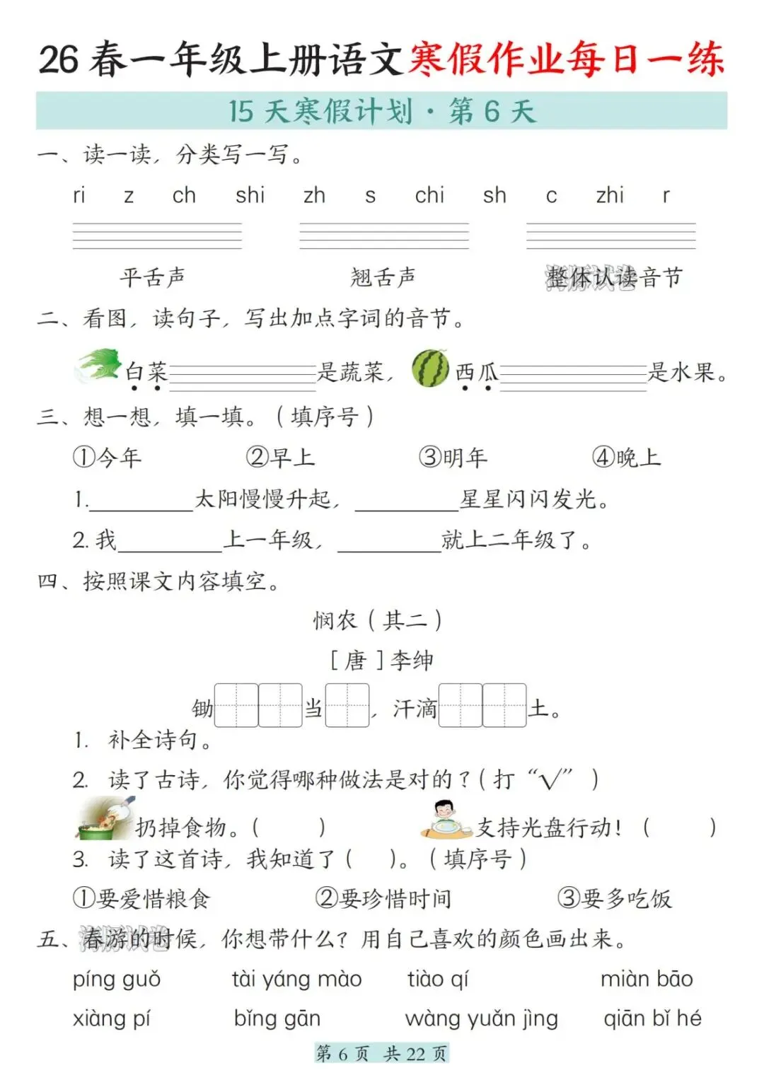 26春一年级语文寒假作业每日一练,电子版可打印
