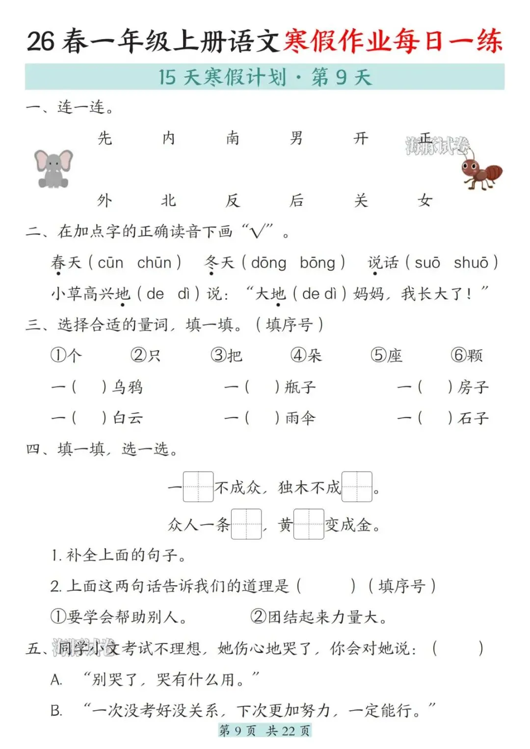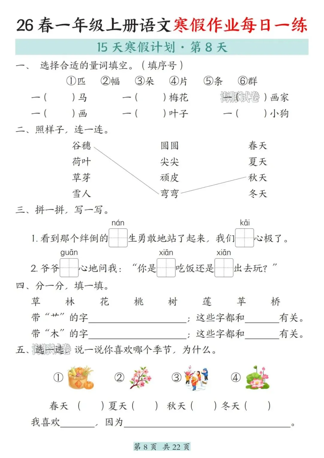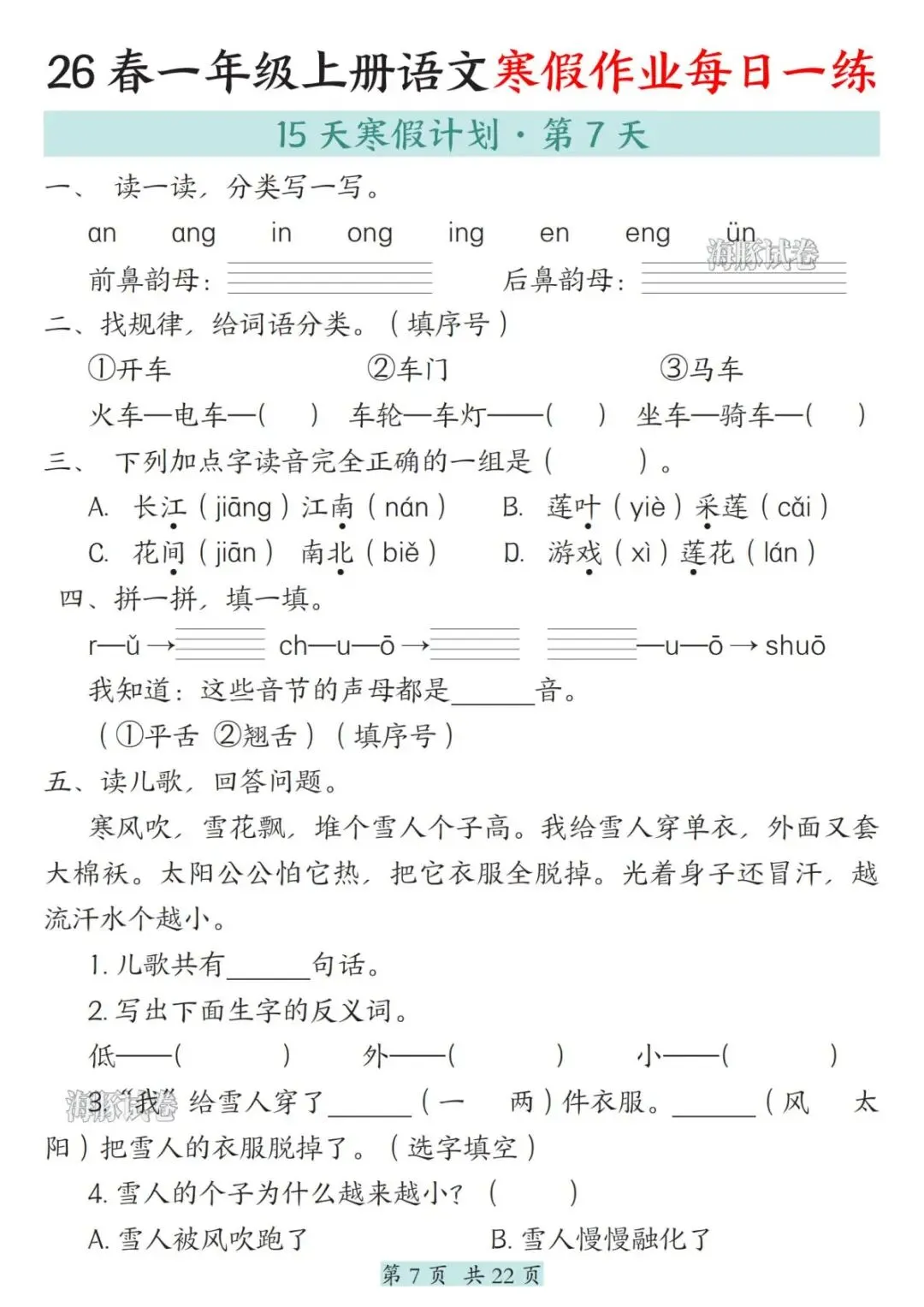 26春一年级语文寒假作业每日一练,电子版可打印