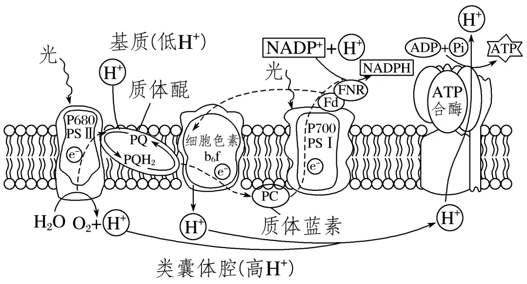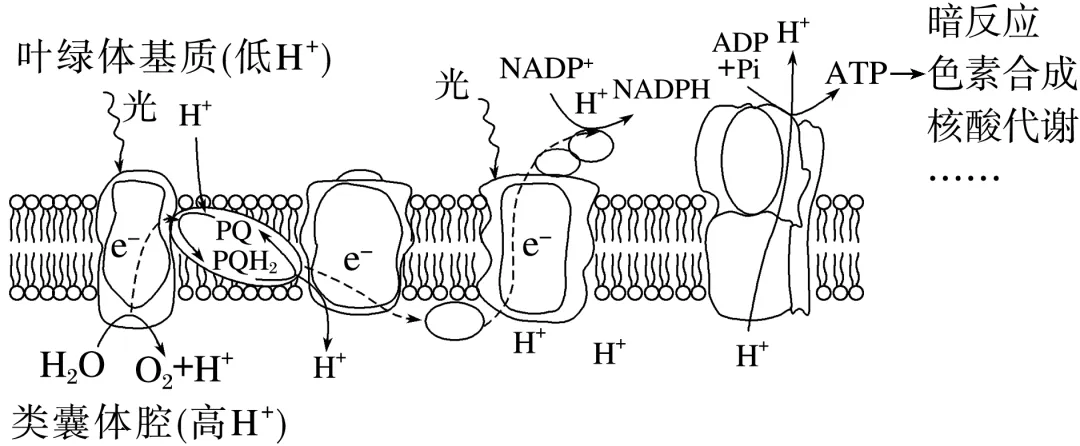 (3)类囊体膜的磷脂双分子层对质子高度不通透,类囊体膜上镶嵌有ATP合酶,类囊体腔中的H+顺浓度梯度经ATP合酶返回叶绿体基质,推动了ATP的生成。