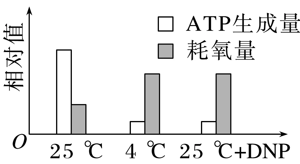 解析 根据题意可知,电子经线粒体内膜最终传递给氧气,与25 ℃相比,4 ℃耗氧量增加,说明电子传递未受阻,A错误;与25 ℃相比,短时间低温4 ℃处理,ATP合成量较少,耗氧量较多,说明4 ℃时有氧呼吸释放的能量较多地用于产热,消耗的葡萄糖量多, B、C正确;DNP使H+不经ATP合酶返回基质中,会使线粒体内外膜间隙中H+浓度降低,导致ATP合成减少, D正确。
