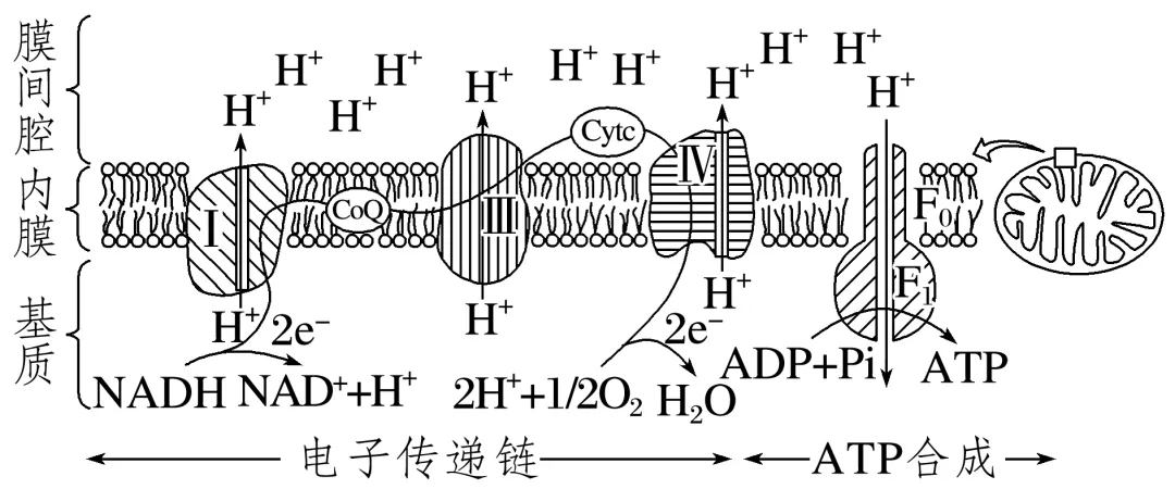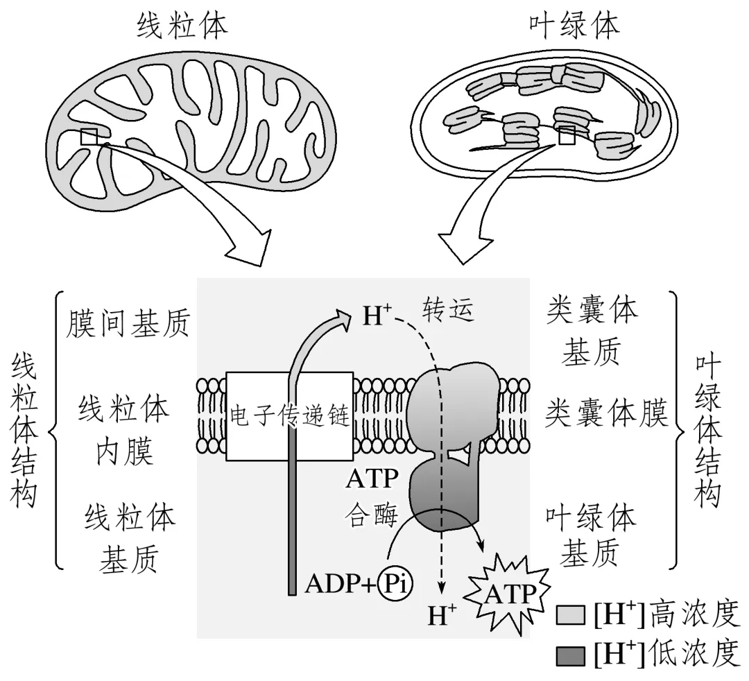 (1)1961年,米切尔提出了化学渗透假说:①线粒体(叶绿体)的电子传递链将H+由线粒体基质(叶绿体基质)泵入线粒体内、外膜间基质(类囊体基质);②线粒体内膜(类囊体膜)的磷脂双分子层不允许H+回流,膜内外产生H+浓度梯度;③H+顺浓度梯度通过ATP合酶回流释放能量合成ATP。