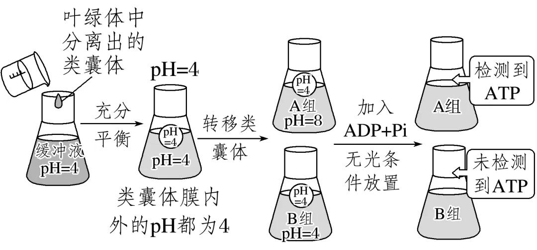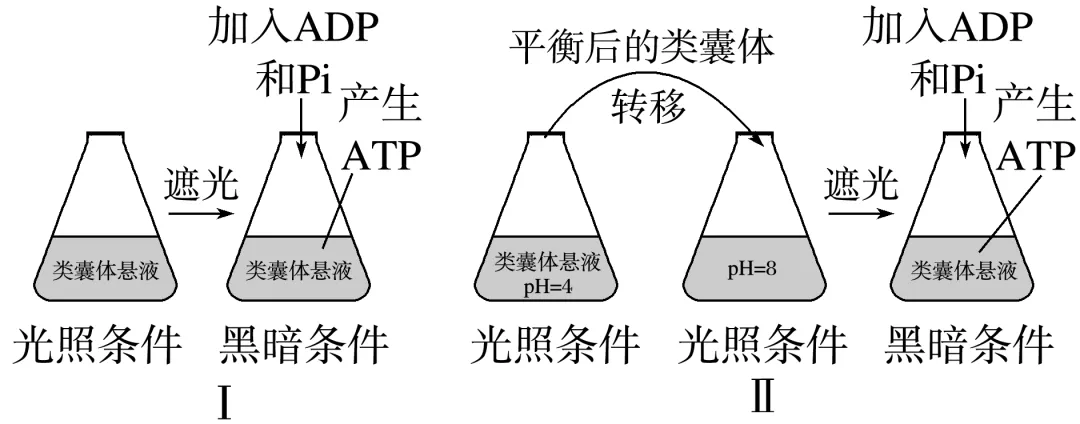 (2)1963年,贾格道夫在黑暗条件下把离体的叶绿体类囊体置于pH=4的酸性溶液中平衡,让类囊体腔的pH下降至4。平衡后将类囊体转移到含有ADP和Pi的A组pH=8和B组pH=4的缓冲溶液中,一段时间后A组有ATP产生。贾格道夫实验表明:类囊体膜内外存在H+浓度差是类囊体合成ATP的直接动力。