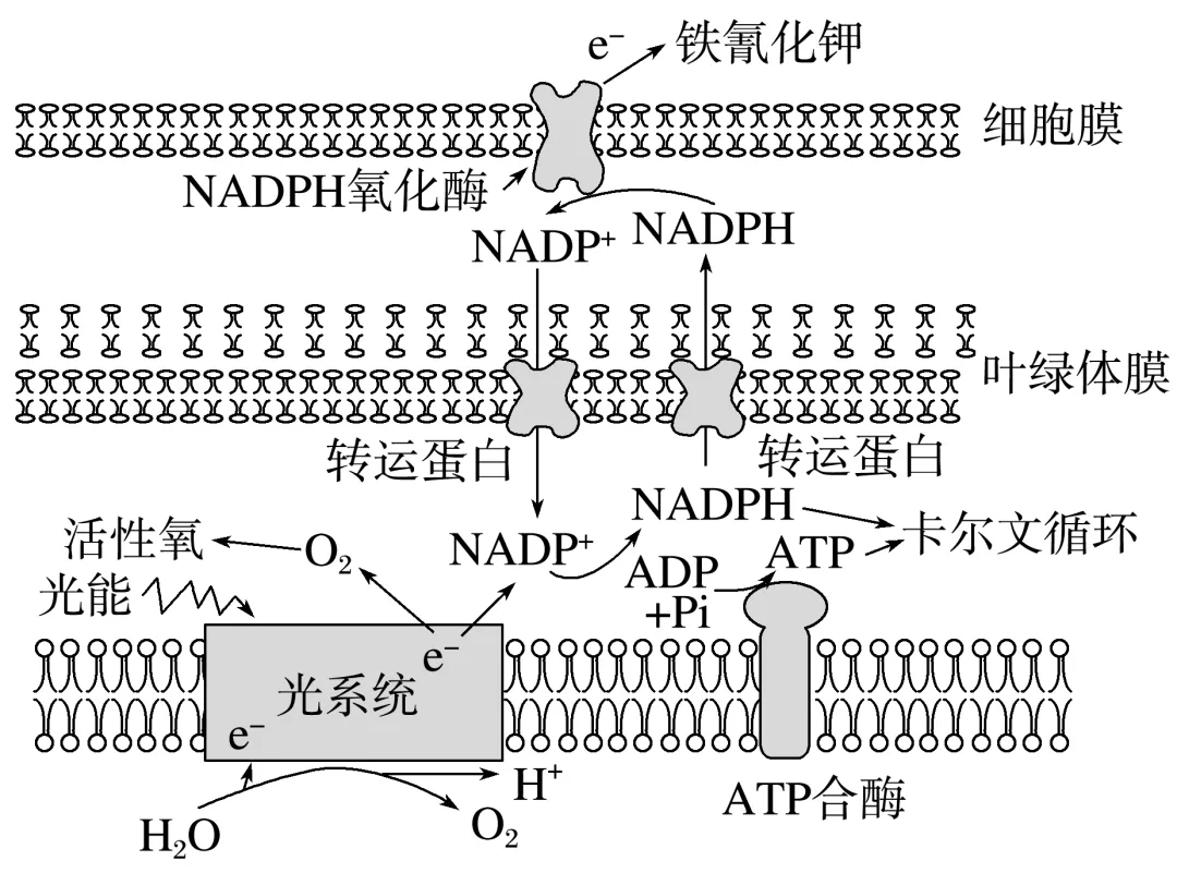 解析 类囊体薄膜是生成NADPH的场所,A错误;强光导致光反应过强,NADPH和电子累积,导致活性氧大量增多,造成光合速率下降,导致光抑制或光损伤,B、C正确;铁氰化钾能吸收电子,适度增加铁氰化钾可能会解除光抑制,D正确。
