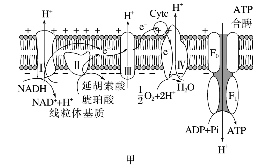 2.(2025·郴州三模)有氧呼吸第三阶段在线粒体内膜上进行(如图甲),叠氮化物可抑制电子传递给氧;DNP使H+进入线粒体基质时不经过ATP合酶。将完整的离体线粒体放在缓冲液中进行实验,在不同的时间加入丙酮酸、ADP+Pi、叠氮化物或DNP,测定消耗的O2量和合成的ATP量,结果如图乙。①②表示生理过程。下列叙述正确的是( )