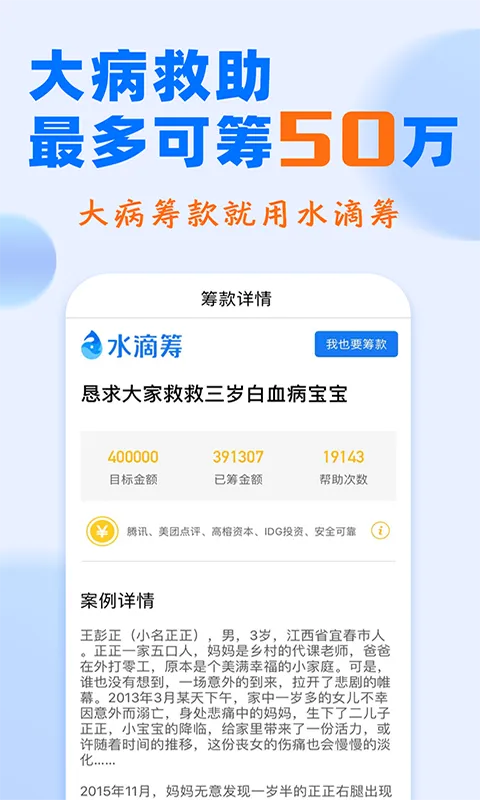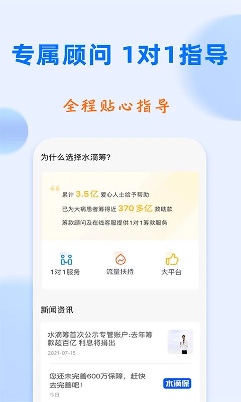 水滴筹APP是专门帮大病患者筹款的爱心平台,已经有超3亿爱心人士伸出援手,累计筹了近300亿救助款。筹款顾问和在线客服提供1对1服务,而且完全不收一分钱服务费。