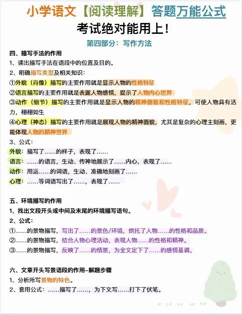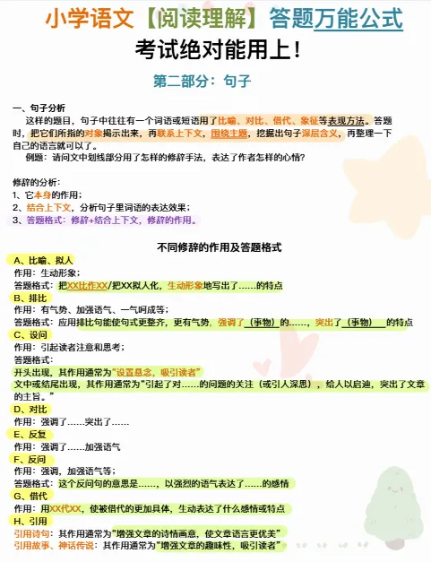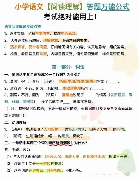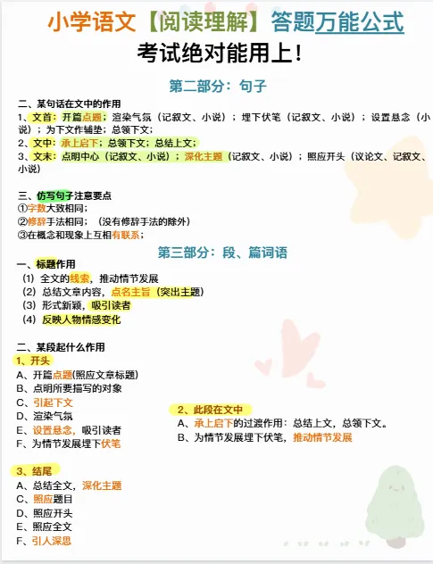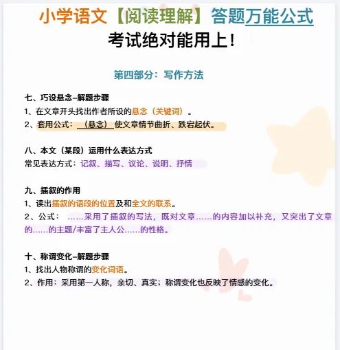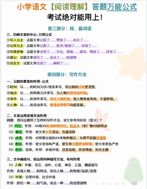 小学语文《阅读理解答题万能公式》|可下载打印 ↓↓↓更多下载内容,点击下方公众号↓↓↓ 版面有限,不过多展示 需要直接拉至文末下载 完整电子打印版免费领取方式 ▲点击上方 语数英父母学堂 在公众号消息框发送: 5076,即可免费领取