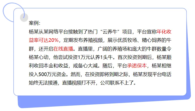 不法分子紧盯市场热点,将虚拟货币、云养经济、元宇宙、碳达峰等概念包装成“高潜力投资项目”,通过伪造养殖视频、虚假政策文件、模拟交易界面等方式虚构投资标的,实则根本不存在具体的实物交易和产业依托。