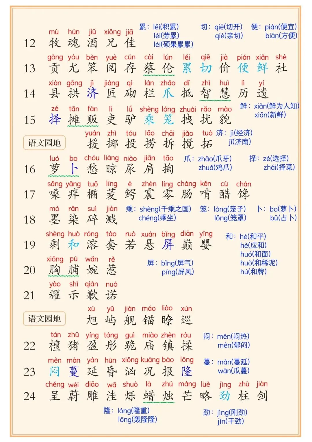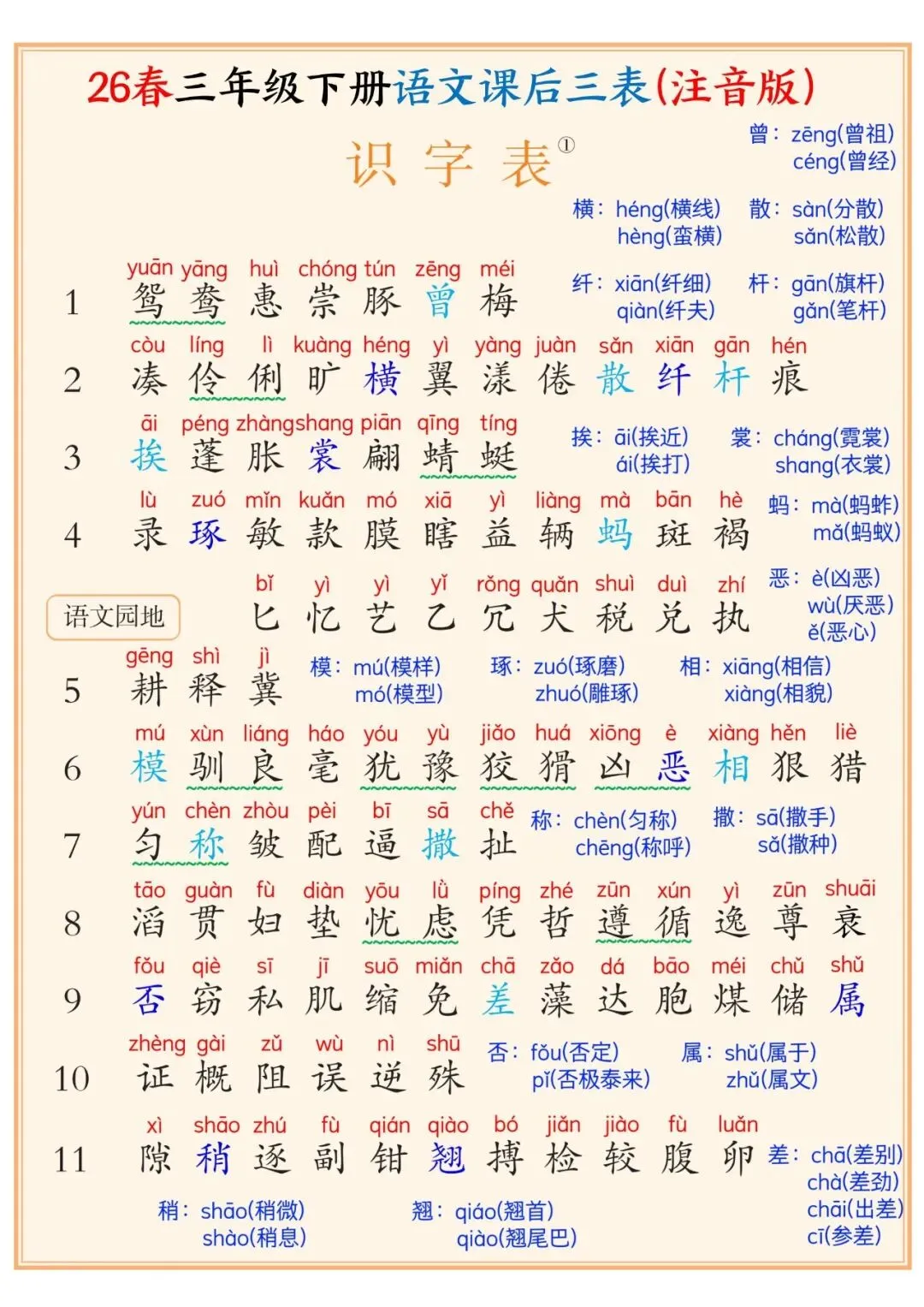 寒假打卡!26春三年级语文三表注音版 可打印电子版8页